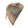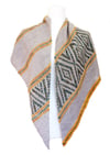 Castle Peak combines mosaic diamonds with dotted stripes and pebbly texture for a shawl that’s fun to make and to wear. This shawl has an asymmetrical triangular shape. It begins with a few stitches and is worked on the bias to grow toward the opposite edge. Stripes of color divide two sections of mosaic diamonds from bands of garter stitch dashes and plain stockinette. Both sizes begin and end with the same patterning, but differ in the arrangement of the middle section.