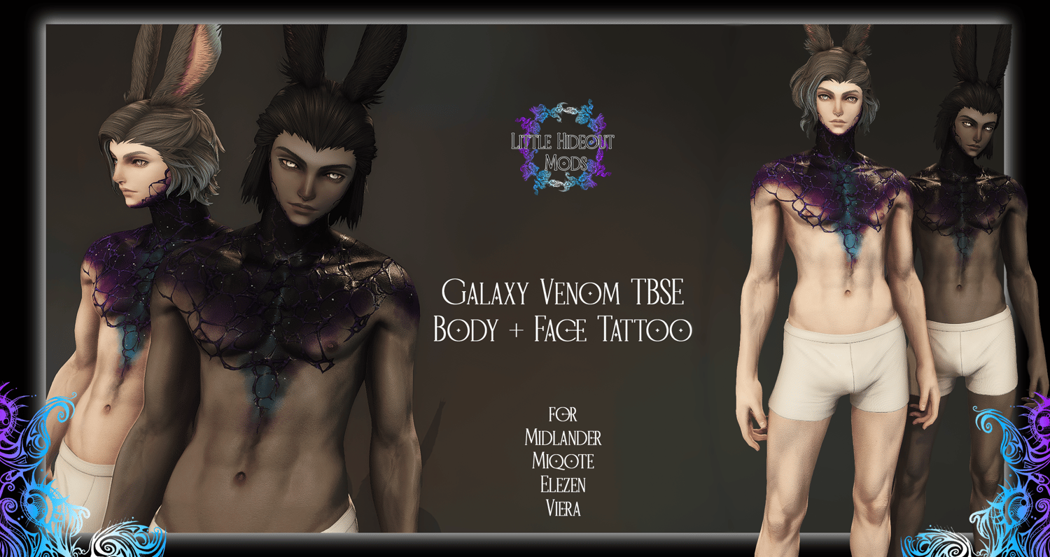 A galactic veil of venom spreads across the chest and neck in black cracks and purple glows—as if something powerful were awakening beneath the skin...