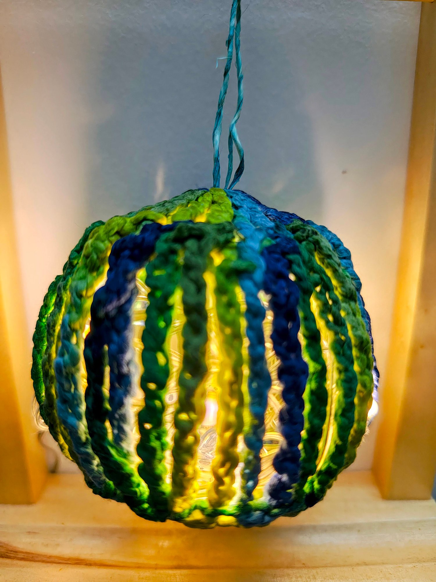 Add Fairy lights to give a nice warm glow or use metallic yarn to get a festive looking bauble!
