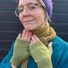 The pattern is for a pair of fingerless mittens or full length mittens worked in the round. You begin at the cuff, which is snug to keep out winter chills. A thumb gusset is worked during the placement of the panel on the back of the hand. The full mittens continue to the end of the fingertips, are decreased on either side and grafted closed. The fingerless mitts have a few rounds of rib to cover the knuckles and thumb and are then cast off.