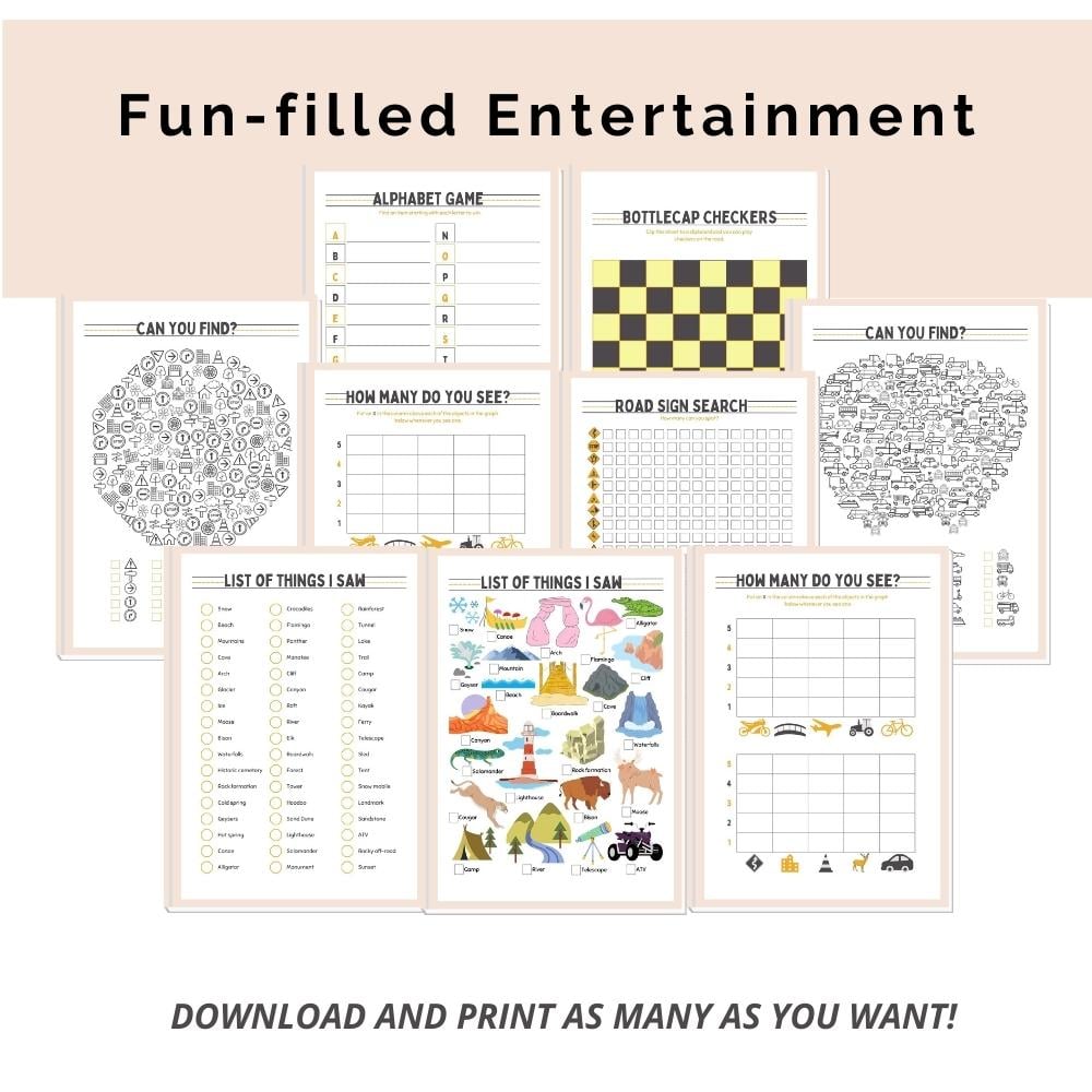 - Fun-filled Entertainment: Keep boredom at bay with an assortment of entertainment pages. Engage in friendly competition with road trip bingo, enjoy classic games like checkers, challenge the alphabet game, and send postcards to friends and family along the way.
