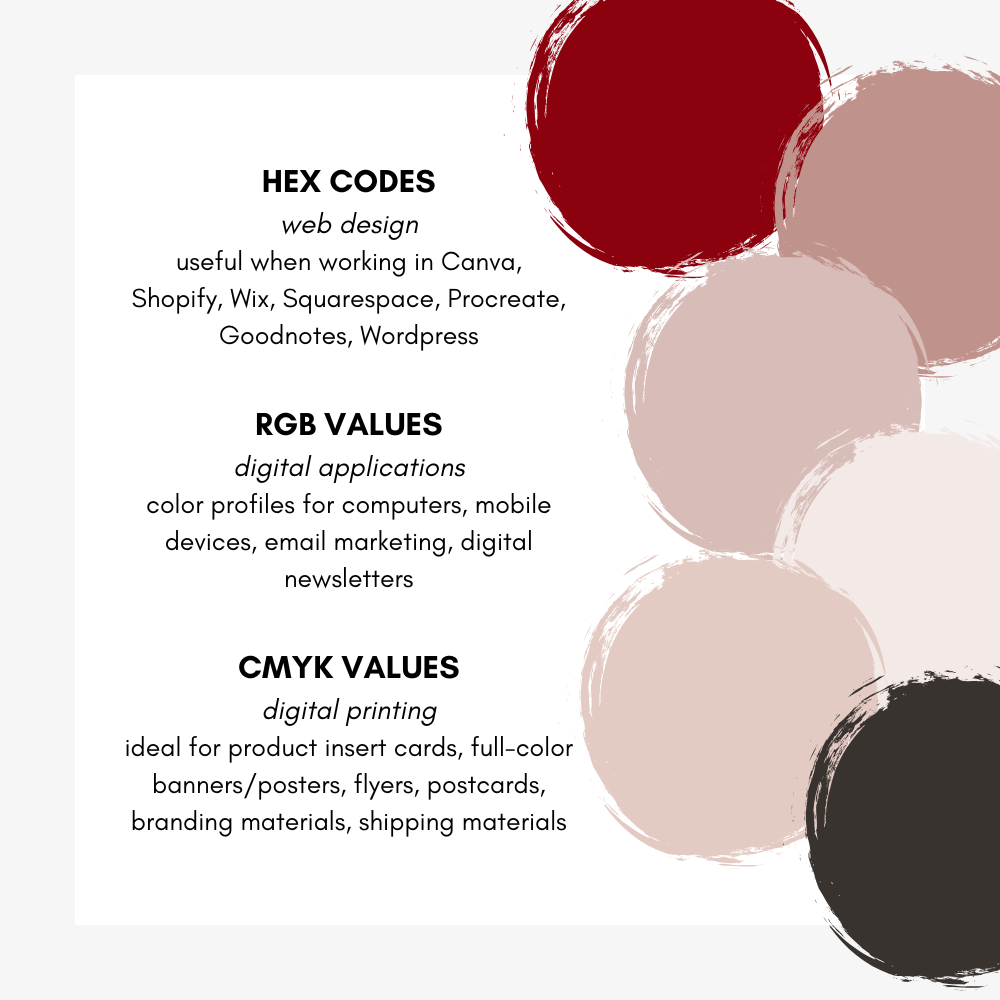 + Detailed Hex Codes, RGB, and CMYK values for each color