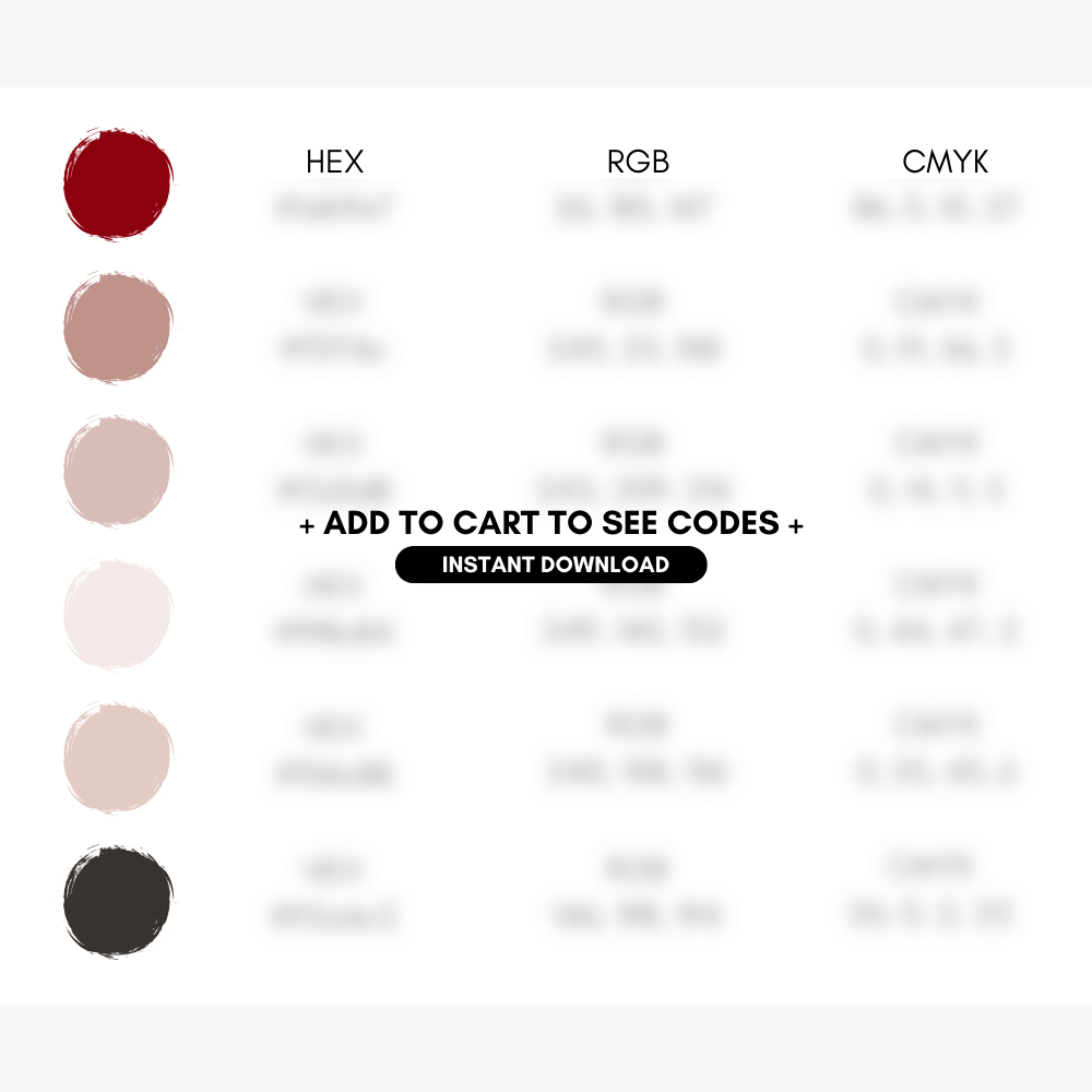 Transform your brand’s aesthetic with our expertly curated Romance Color Palette, designed to infuse your visuals with a captivating and dramatic charm. Featuring a blend of dark cherry red, taupe, blush, pale pink, sand, and charcoal black, this palette offers a stunning array of neutral warm earth tones with a pop of drama with crimson and and dark charcoal, perfect for any small business looking to elevate its identity. Whether you’re a marketing maven or a creative entrepreneur, these dynamic hues will bring your branding, packaging, and website to life. Ideal for use across social media, logos, banners, print, and digital designs, our color scheme includes precise Hex Codes, RGB, and CMYK values to ensure consistency and vibrancy in every project. Compatible with platforms like Canva and Procreate, this color palette is an essential tool for crafting a cohesive and memorable brand identity, without any of the guesswork. Elevate your design game today and let your creativity shine with these enchanting colors!
