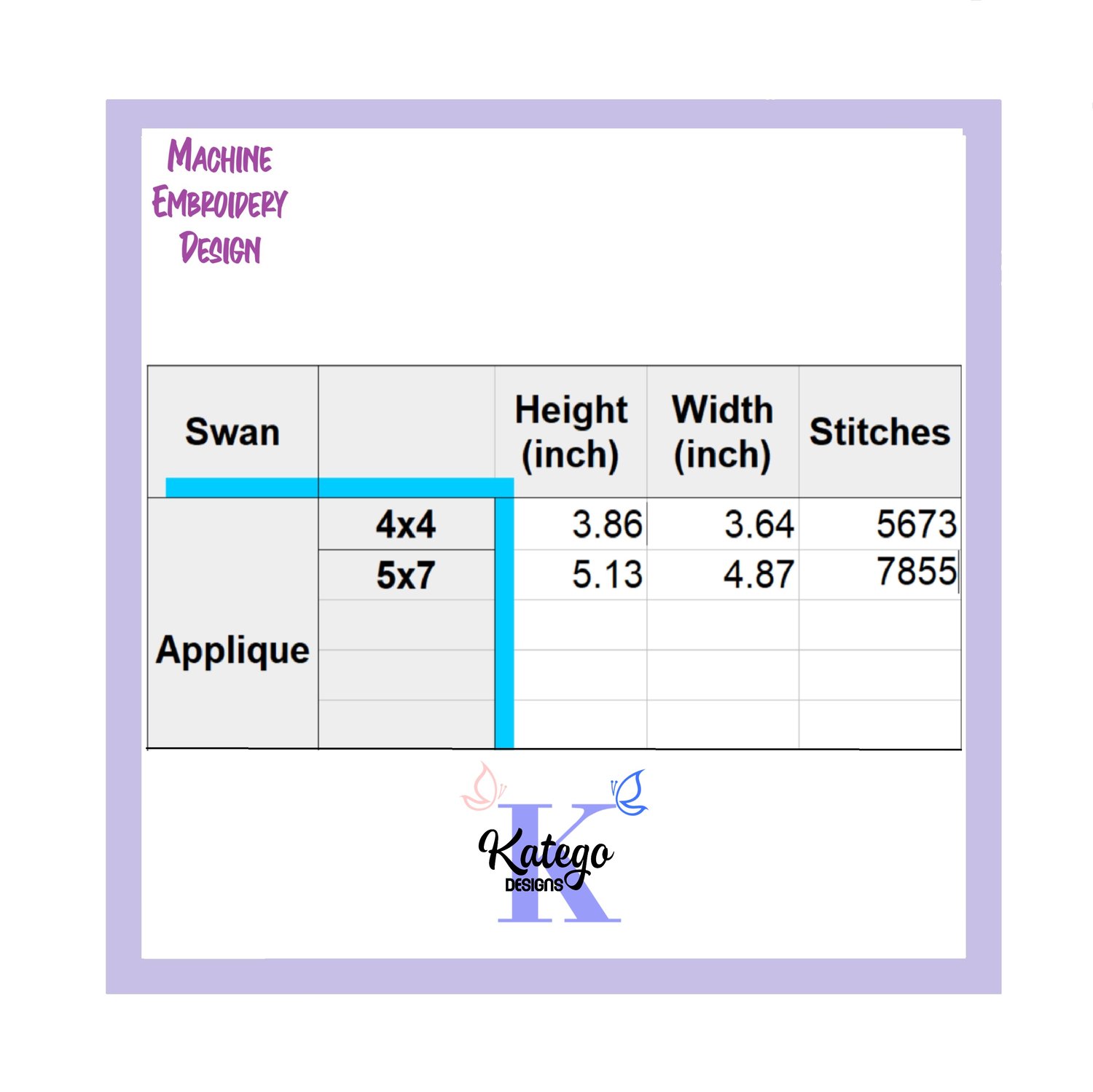 - Swan Applique: 4x4 and 5x7 Hoop.