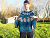 Le pull Prairie Cats est tricoté de haut en bas en rond avec un yoke circulaire. Le corps et les manches sont séparés aux emmanchures et tricotés séparément en rond.