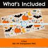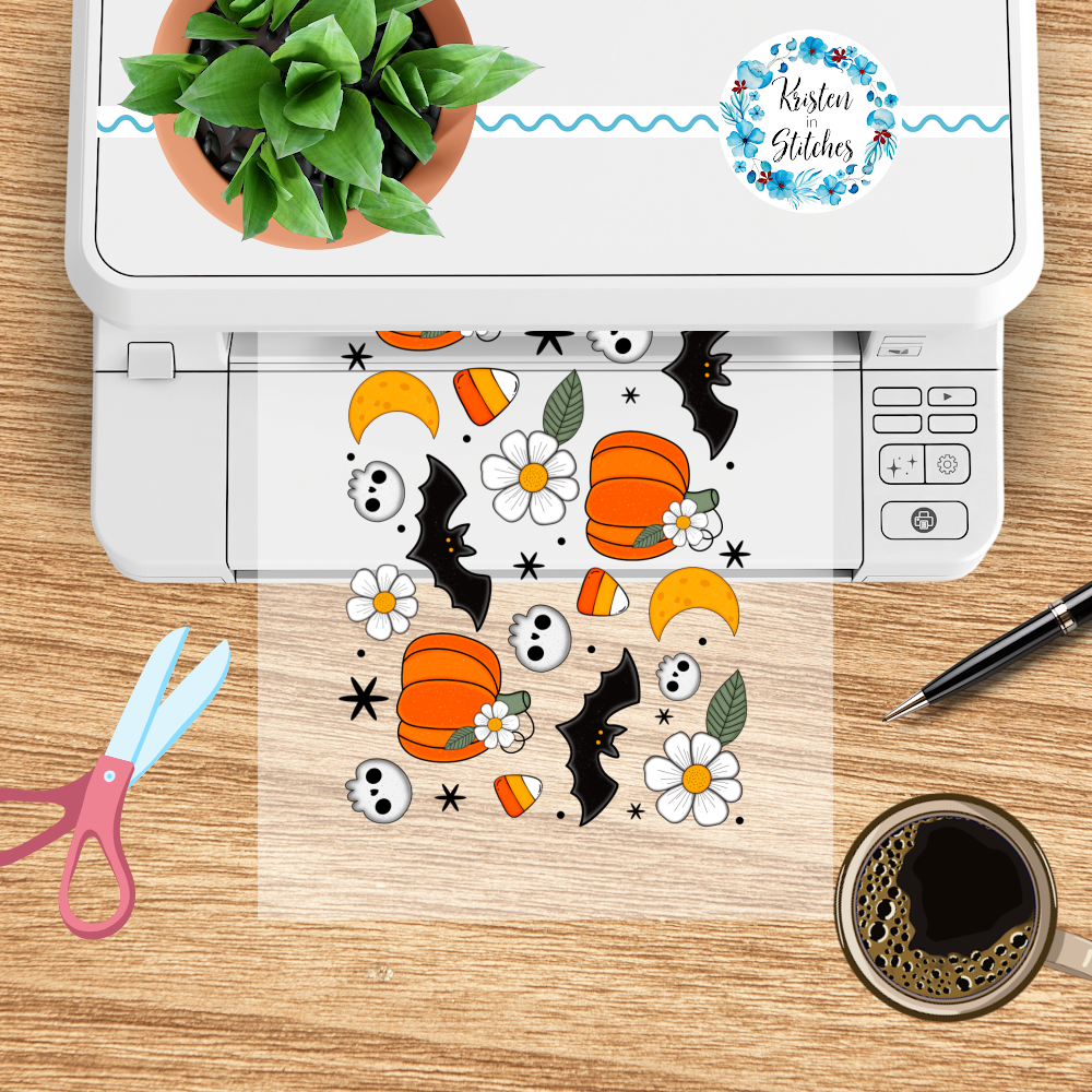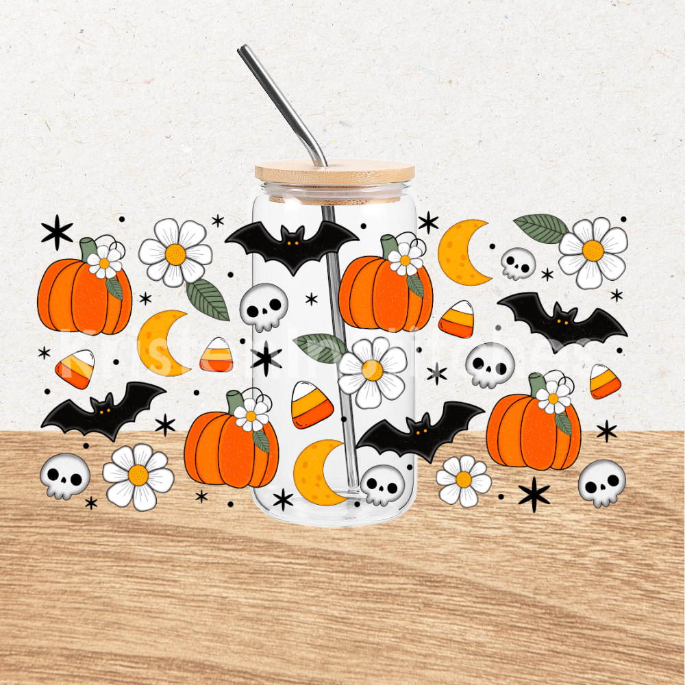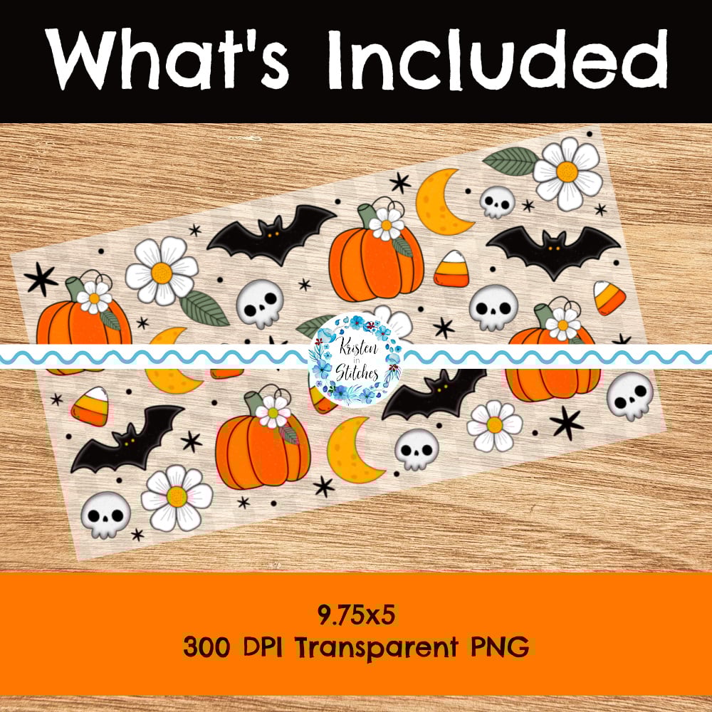Features cute pumpkins, daisy flowers, skulls and bats.