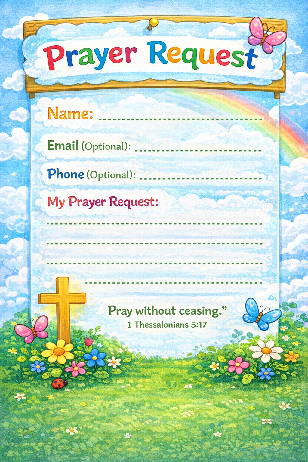 A clean, inviting layout for individuals to write down prayer needs, praises, or requests—perfect for church services, Sunday school, Bible study groups, or home devotionals.