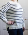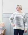 This simple nautical striped pullover is a perfect sweater for cold summer days, when the wind breeze is so cold that you need to throw wool on. The pullover is worked seamlessly from the top down, with a raglan yoke and sleeve shaping. The body length of the pullover can be easily modified, if preferred.