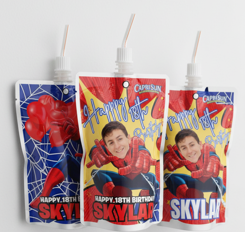 Spider-Man Drink Pouch Birthday Templates | Canva Editable Superhero Capri-Sun Style