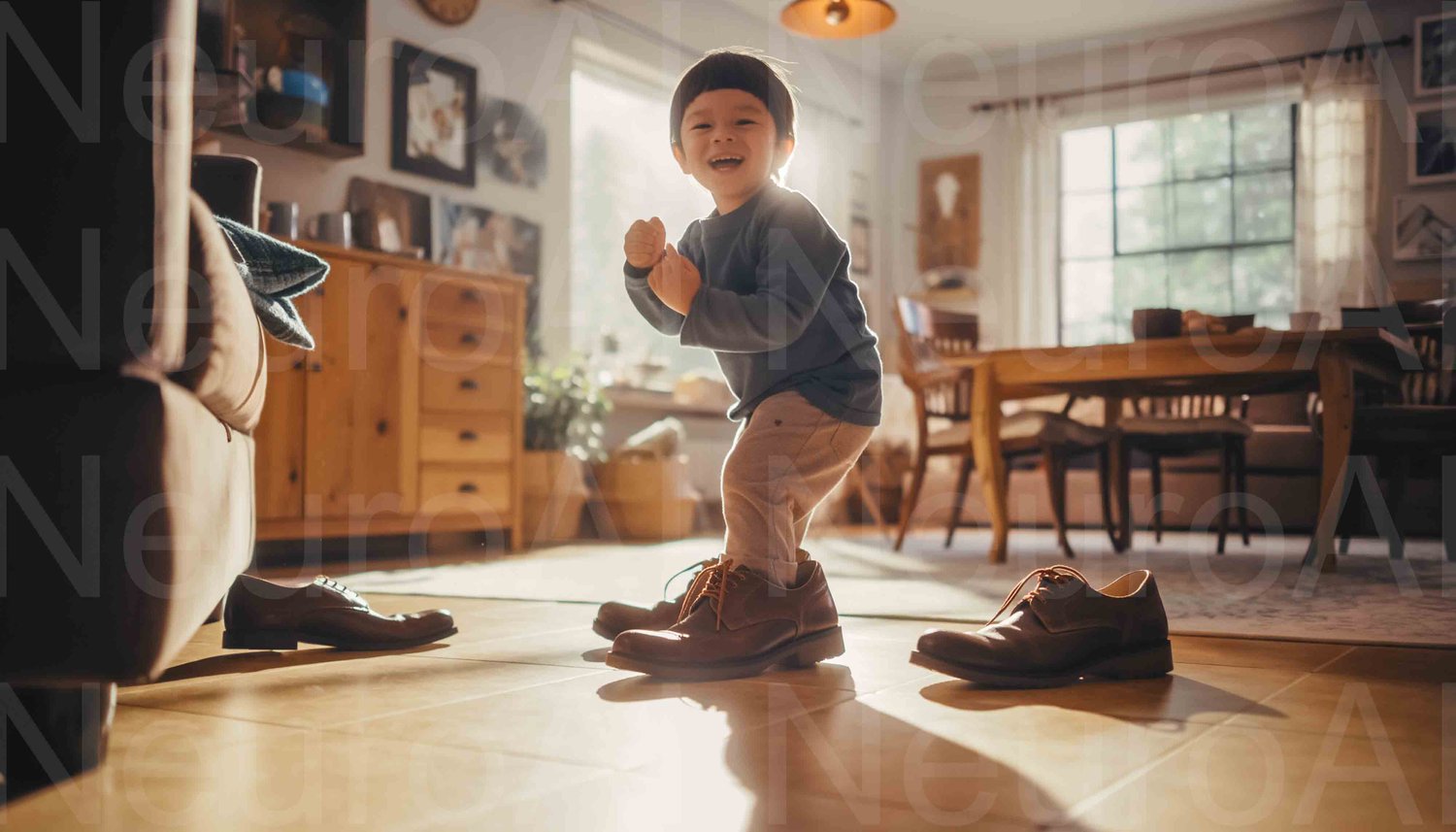 Joyful child playing dress up in oversized shoes at home