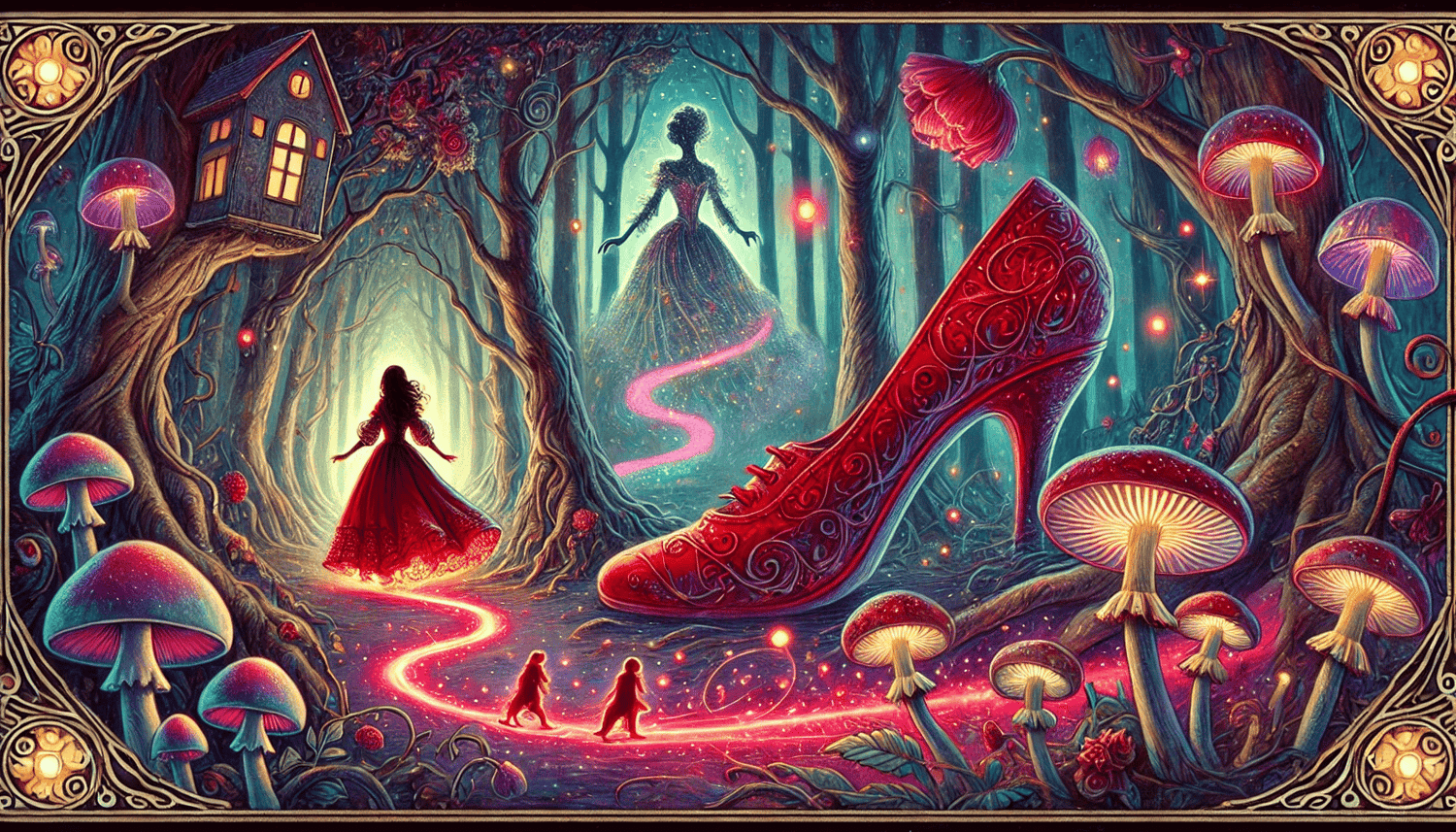 Unlock the magic of fairy tales with The Red Slippers, a one-of-a-kind fantasy artwork inspired by the timeless story of Cinderella. Set in an enchanted forest filled with glowing mushrooms, whimsical trees, and a majestic red slipper, this image evokes the mystery and charm of classic fables—reimagined with a magical, surreal twist.