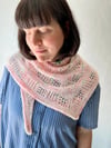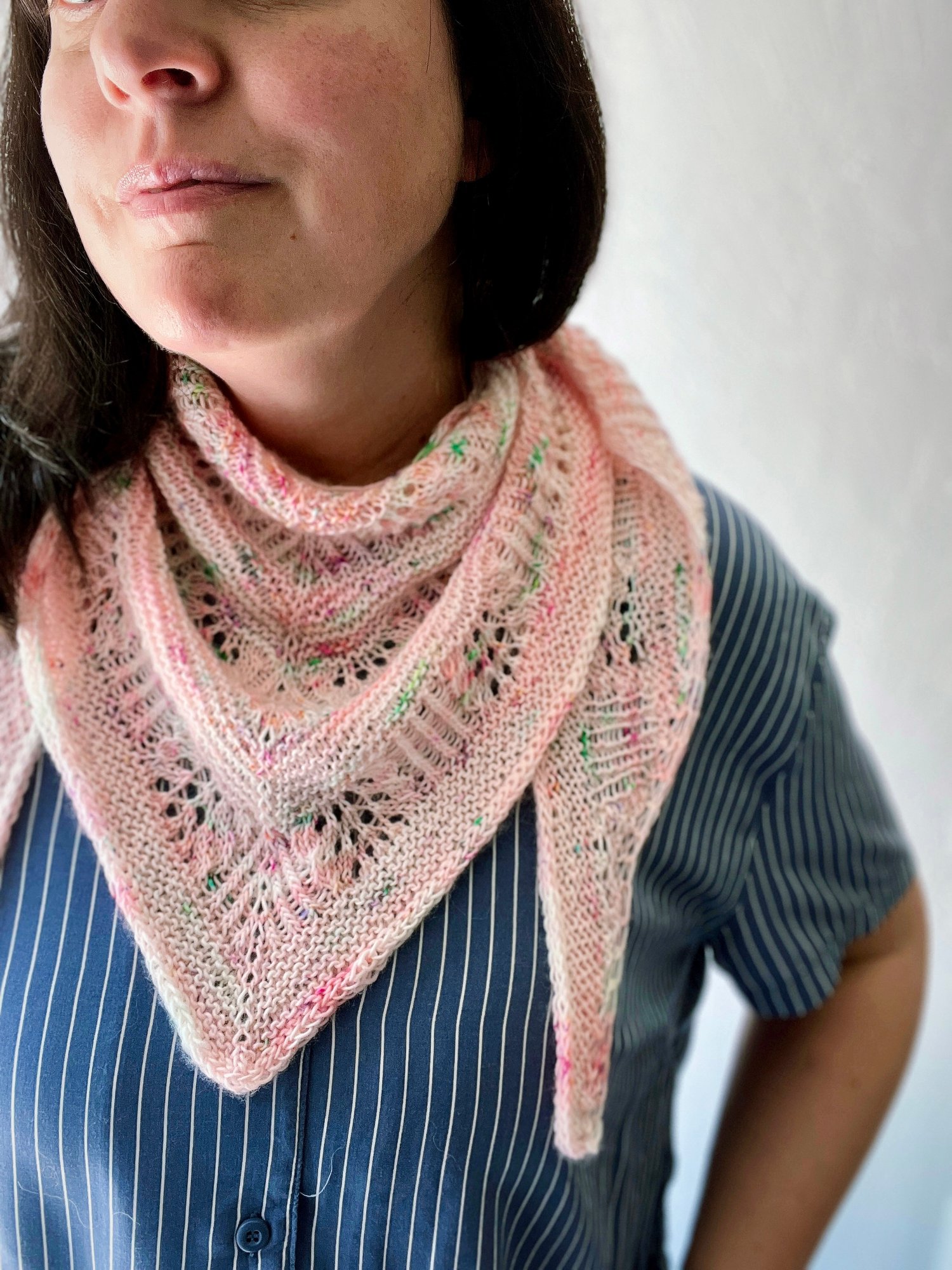The shallow triangular shape gives plenty of length without too much depth, making it easy to wear and style. The mix of garter stitch and lace creates a pleasant rhythm, offering both calm and interest throughout the knitting process.