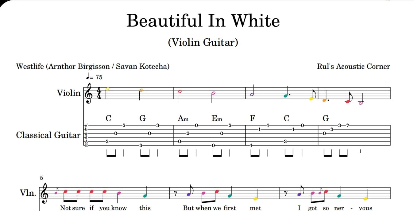 Sampel Lesson Instrumental Westlife - Beautiful In White Violin Guitar Musical Notes Tabs High Quality PDF Video