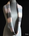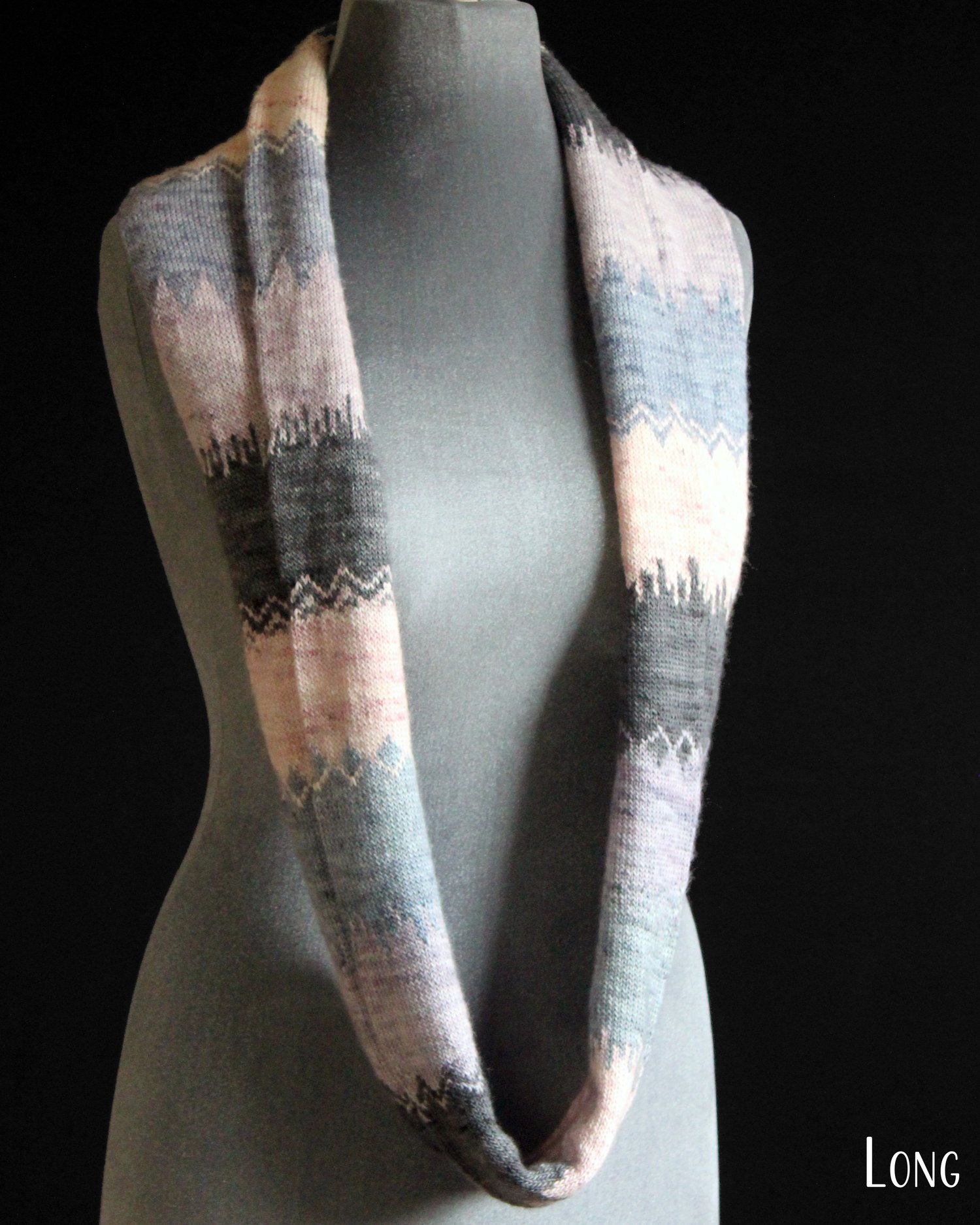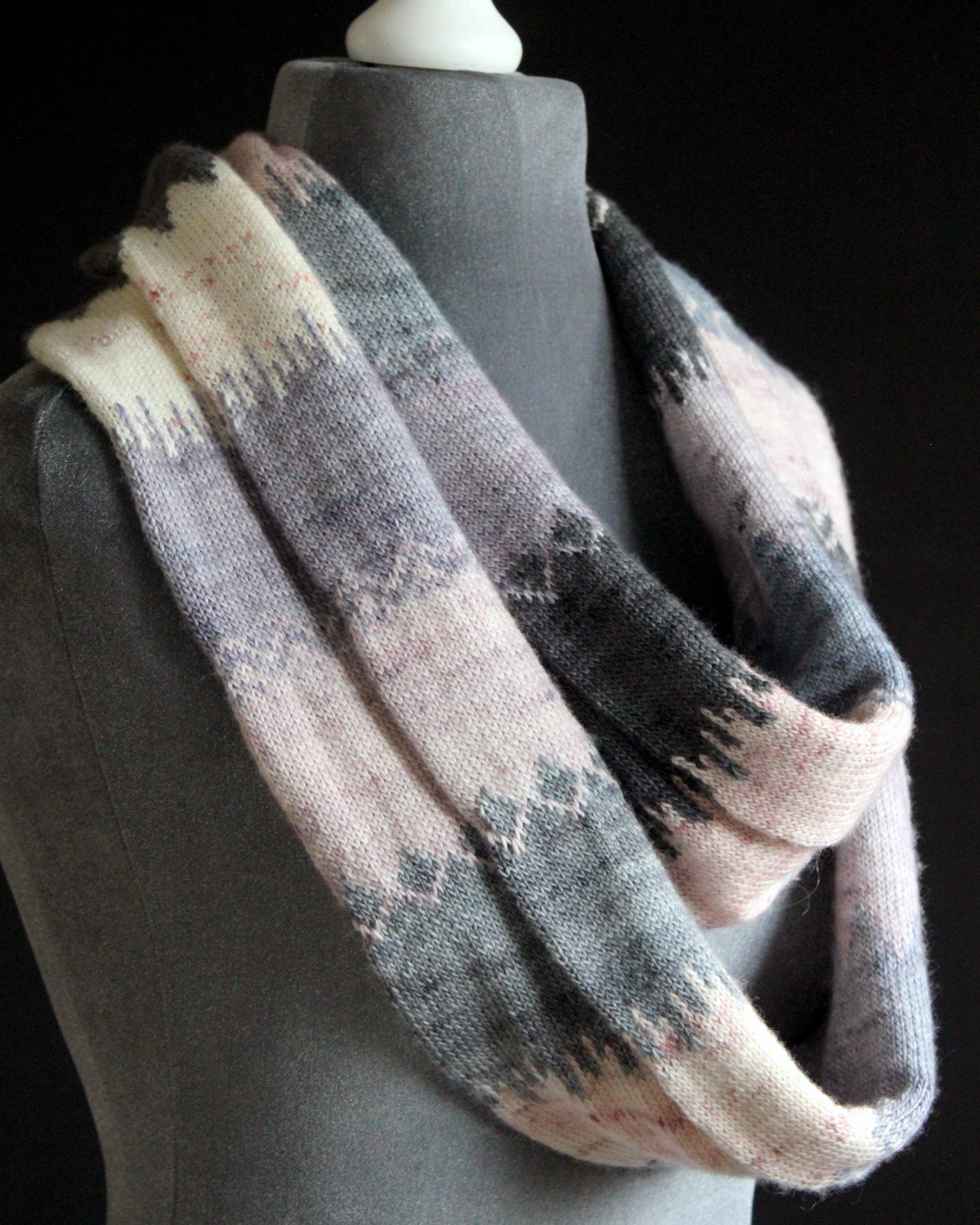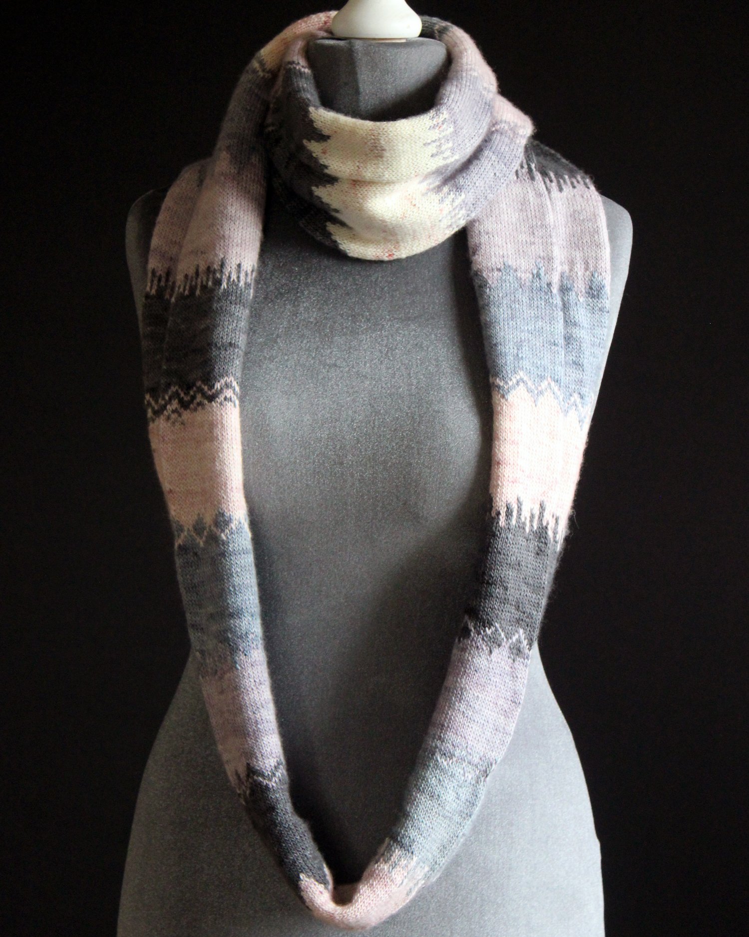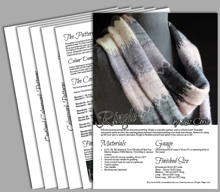 A Scots word meaning a stripe around something, Ringle is a double layered, cowl or infinity scarf. Stranded colourwork patterns mark the meeting places between the stripes adding a fun twist and interest. Ringle is perfect for using up all your leftovers, or for 20g minis. Use as few as two colours or as many as 24, or mix it up and alternate a main colour with many contrast colours!