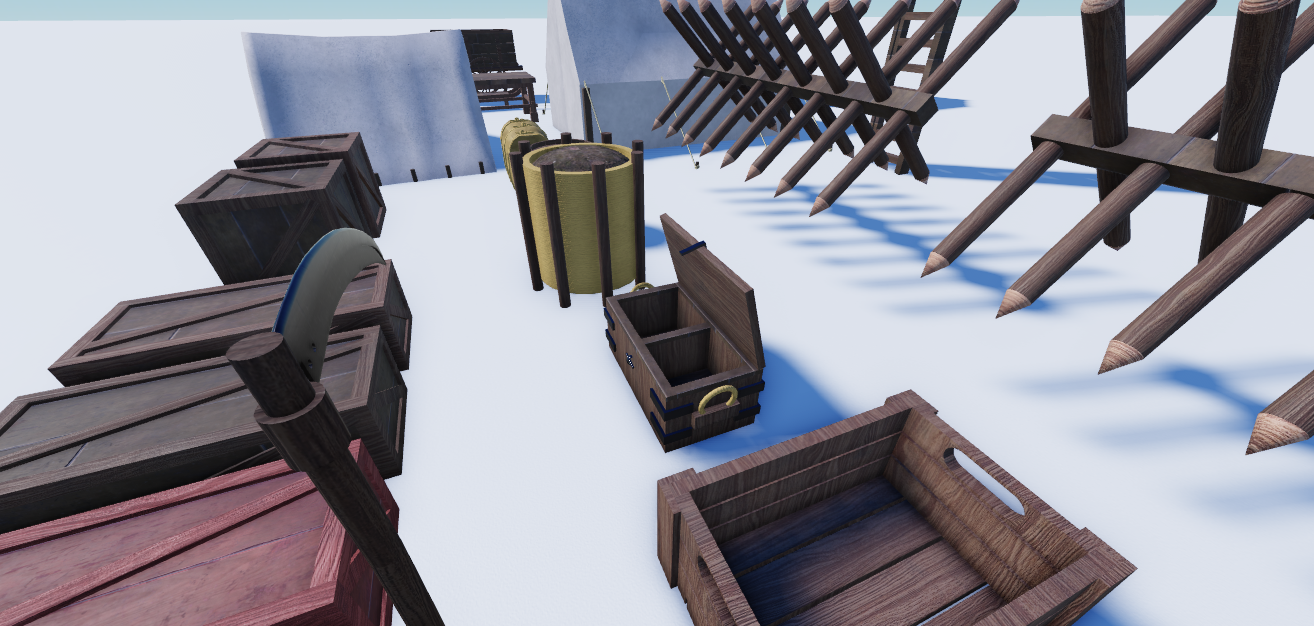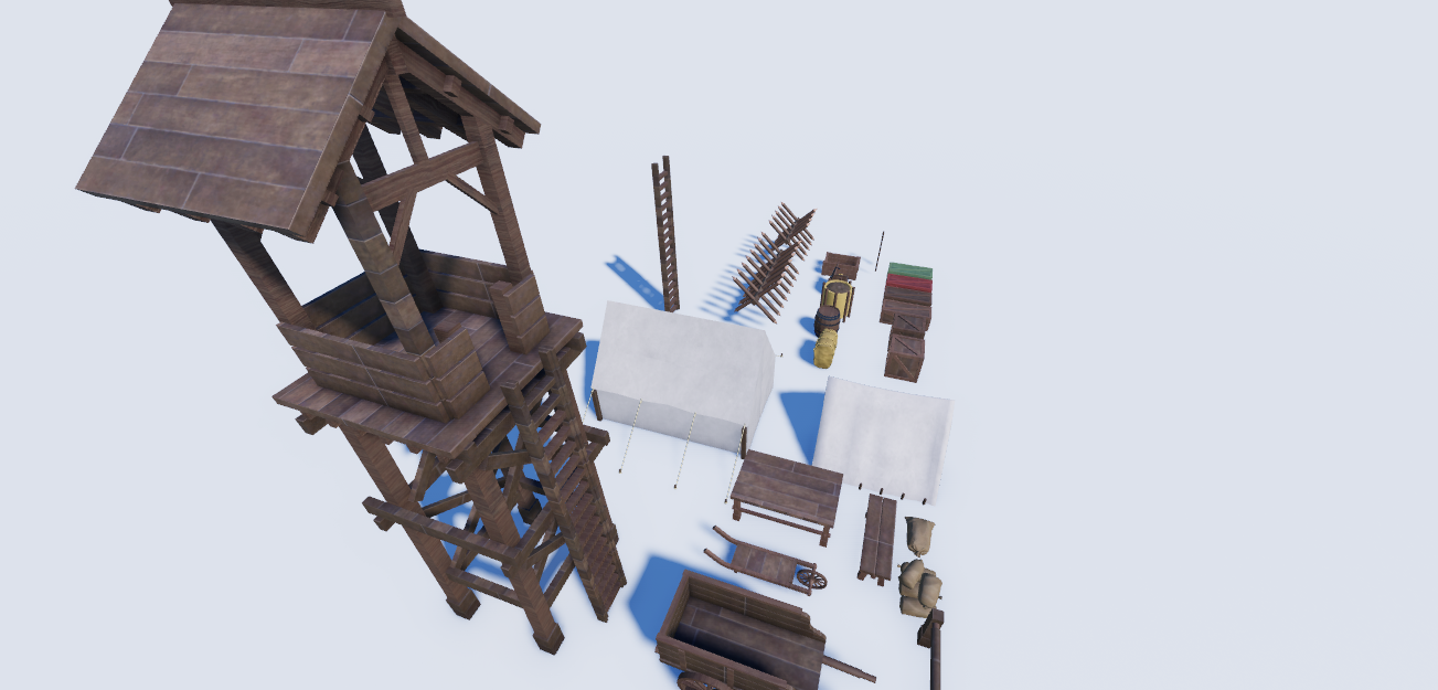 - Includes a Watch Tower, 2 tent models, 7 crate variations, cart, 2 sandbag variations, supply box, 2 Scythe variations, horse post, gabion, barrel, haybale, table, bench, stroller, cheval de frise and a ladder