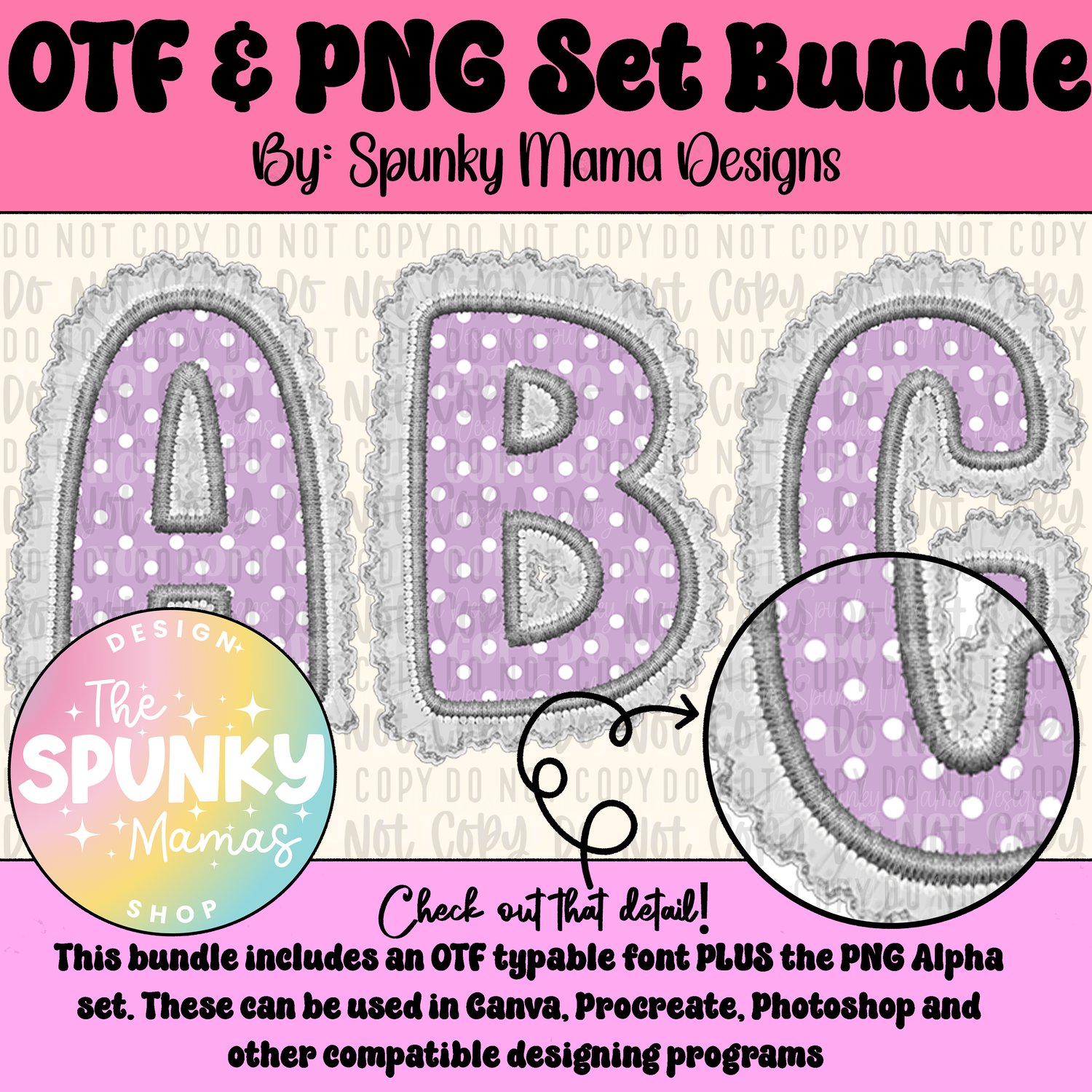 Vintage Granny Purple Polka Dots OTF Font & Digital PNG Alpha Set