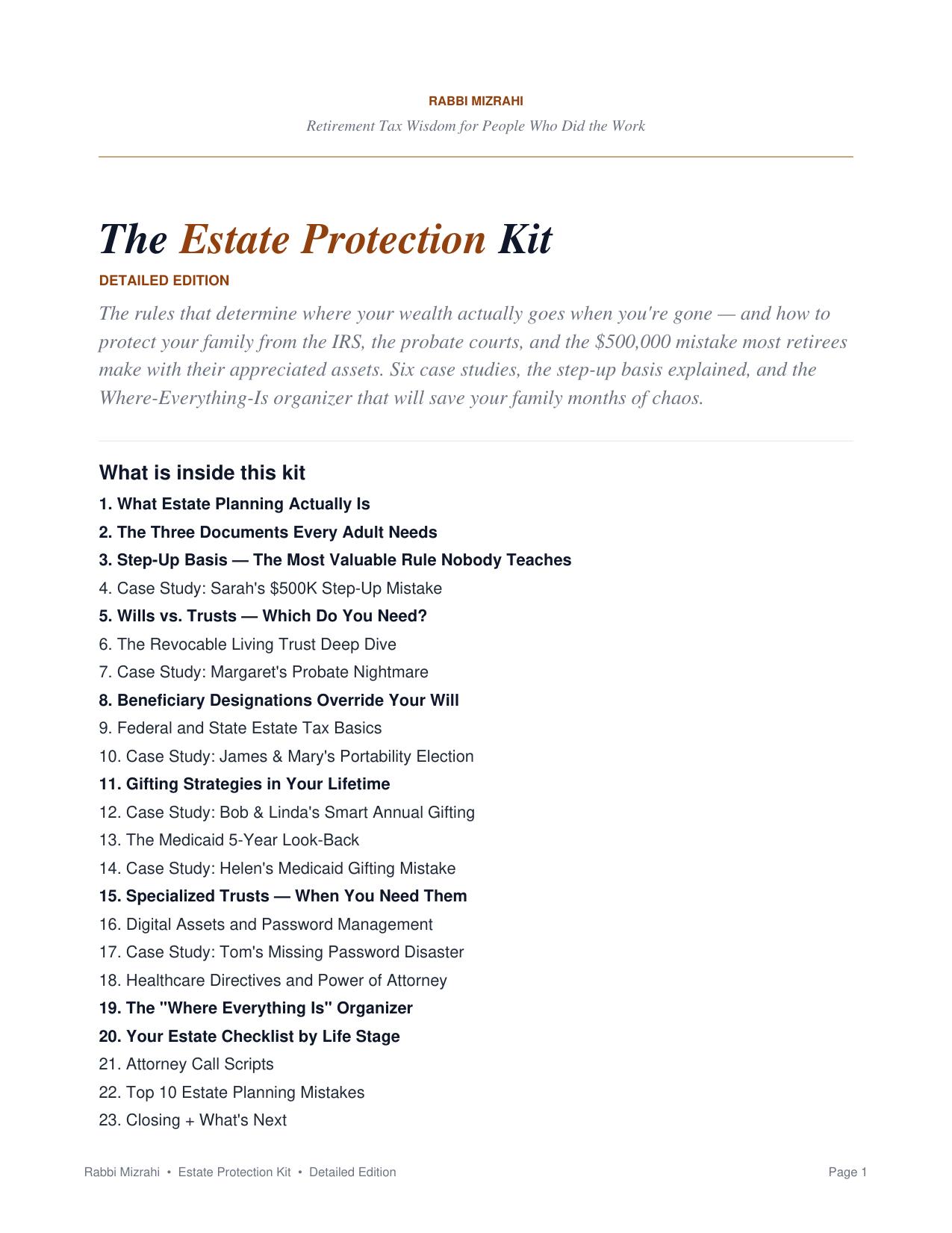 Most Americans leave this work half-done. A will without a trust. A trust without funding. Beneficiary forms that contradict the will. Passwords nobody knows. This kit walks you through the full structure — the documents, the strategies, the templates, and the case studies of what goes wrong when any piece is missing.