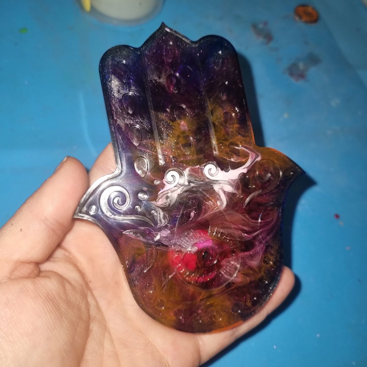 From deep cosmic blends to soft ethereal tones, each Hamsa Hand is made to order with mesmerising swirls and depth.