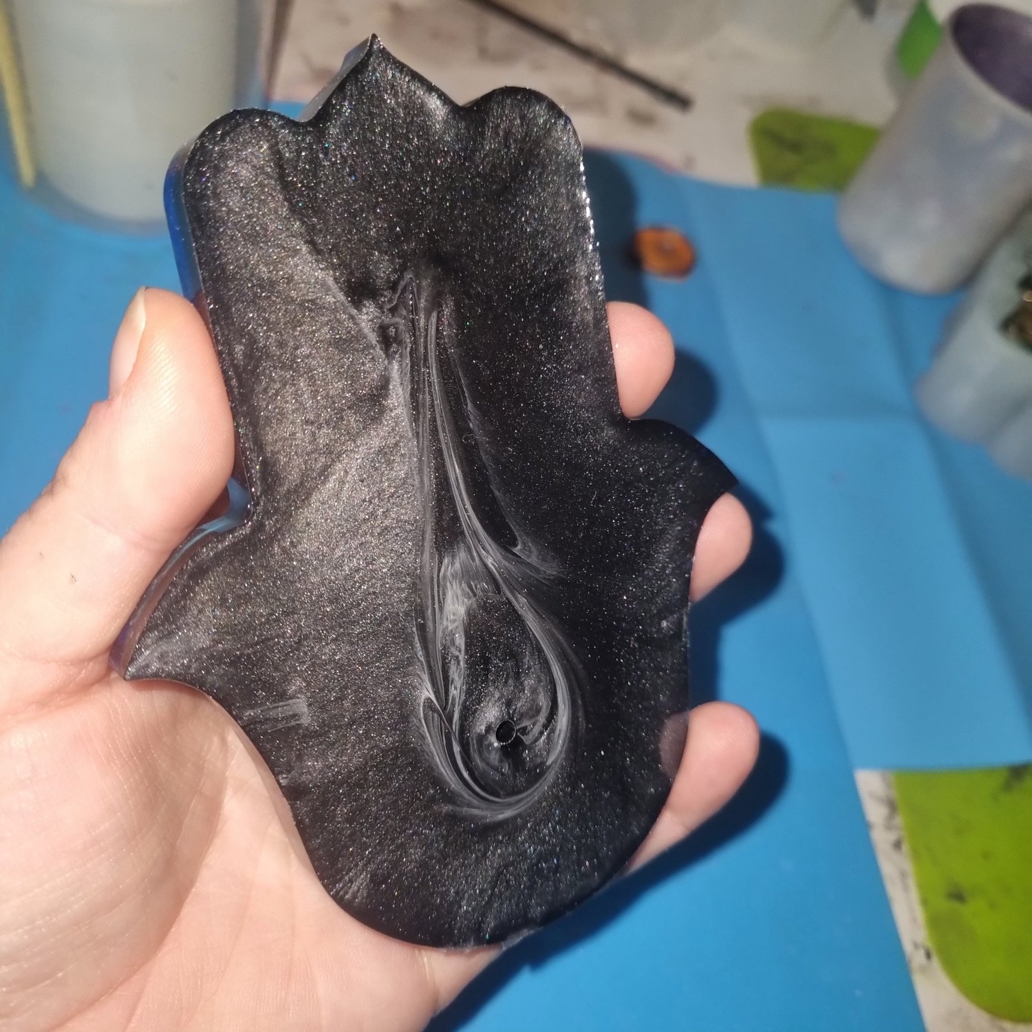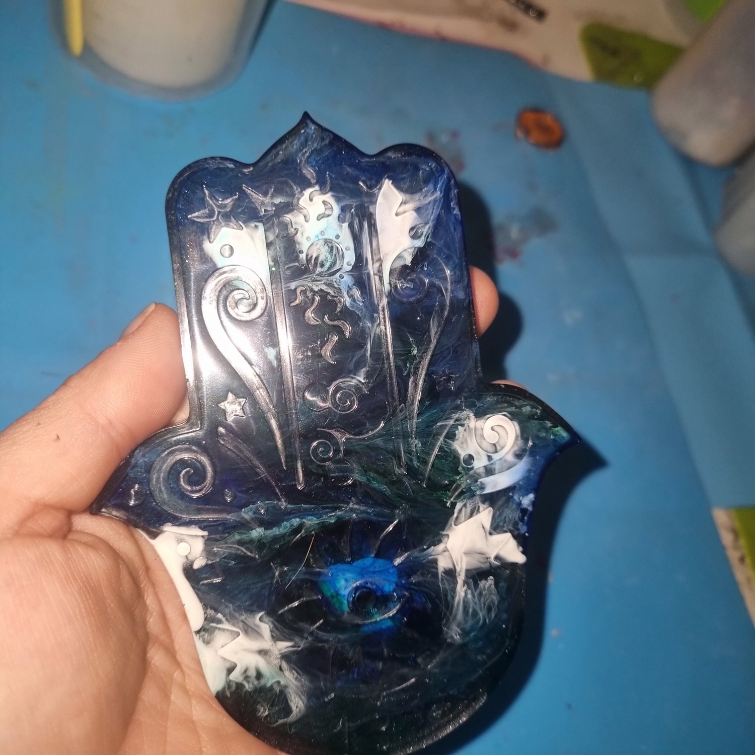 Bring a touch of mystical elegance to your sacred space with this handcrafted Hamsa Hand incense holder, made by Alternative Creations UK. Each piece is lovingly cast in resin and features beautiful, flowing colour swirls unique to every pour—no two will ever be the same.