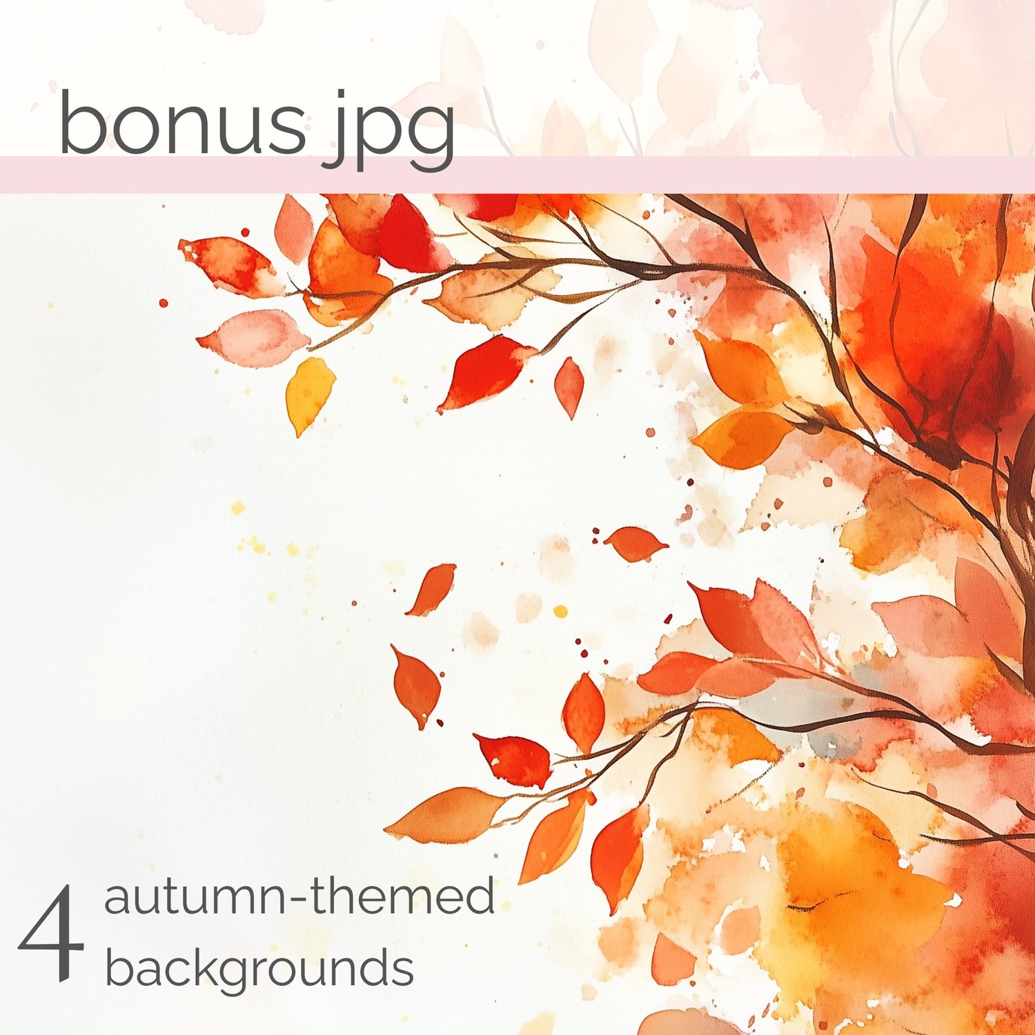 You will receive a 2 ZIP files containing 17 (seventeen) PNG files and 4 free JPG fall-themed backgrounds.