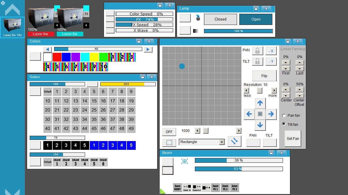 * Verifique, con un Fixture de pruebas (click), que coincidan estos canales: 1 Encendido/Apagado, 2 en el valor 60 = Color Verde, 5 Figuras, 13 Movimiento X.