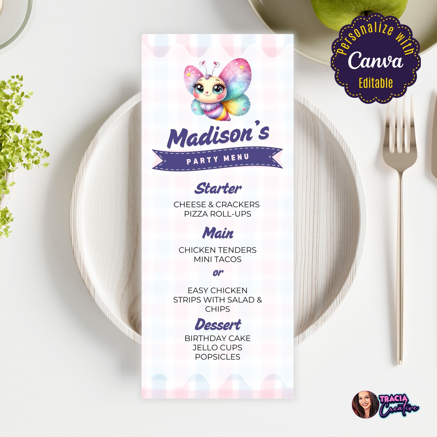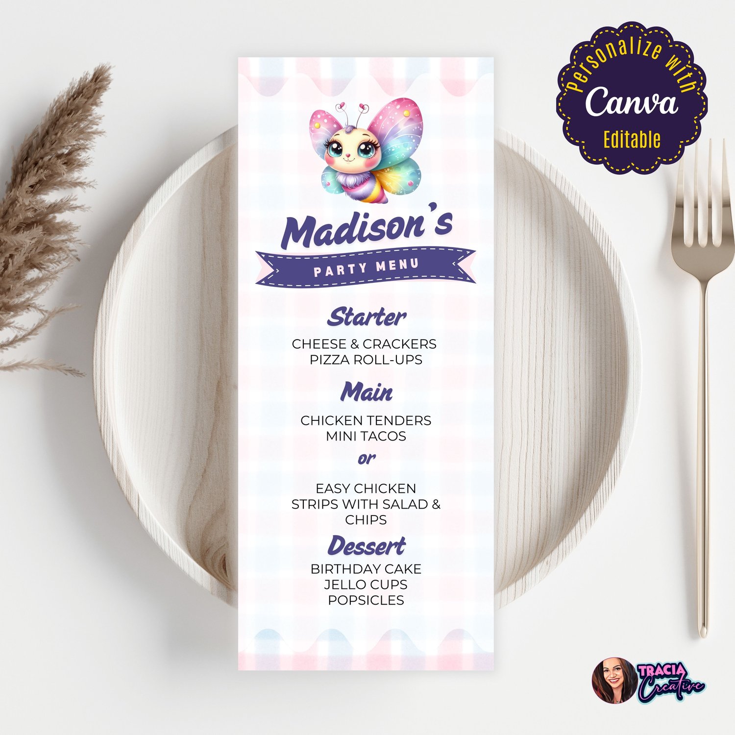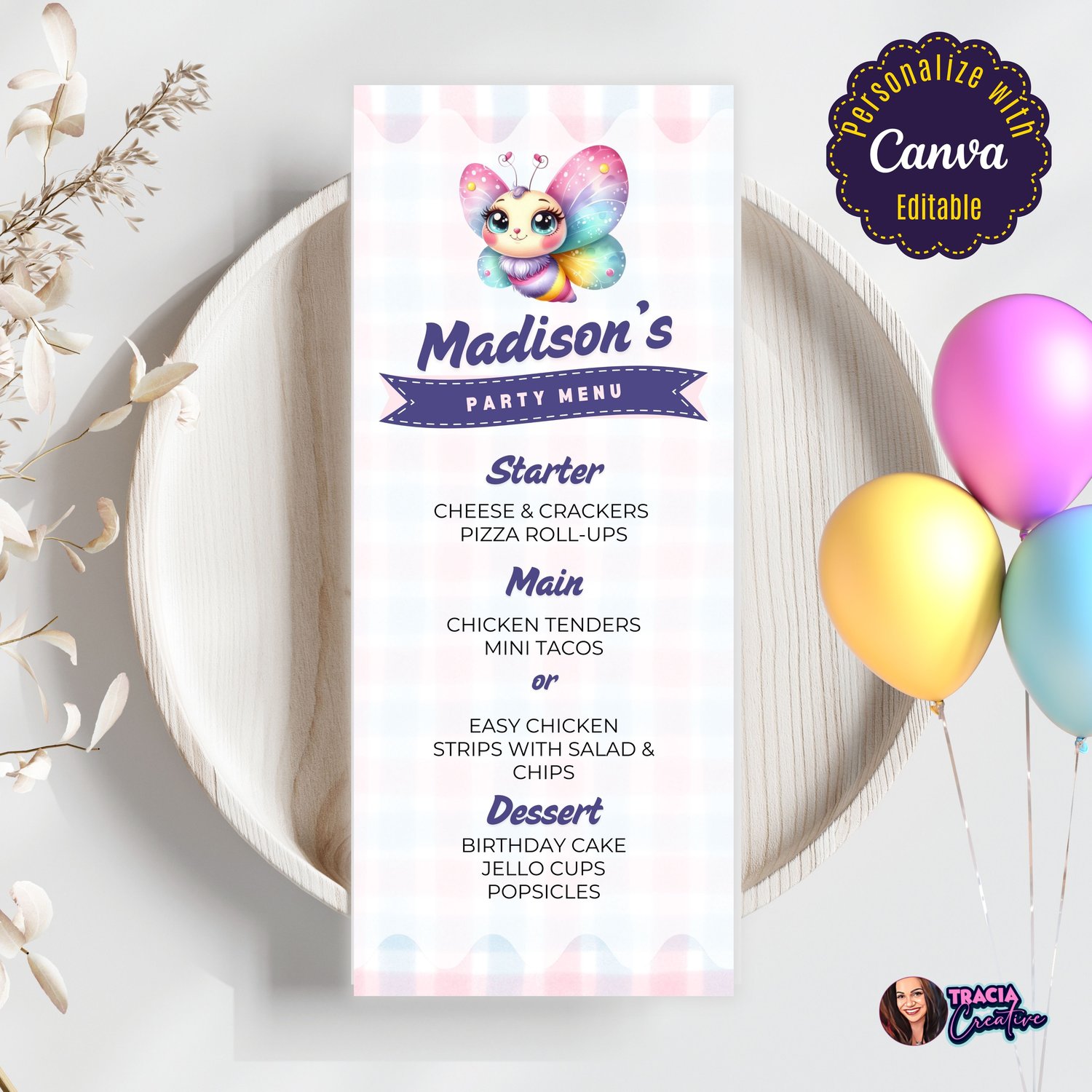 Butterfly Birthday Party Menu | Editable Canva Template | Digital Download | Kids Party Printable
