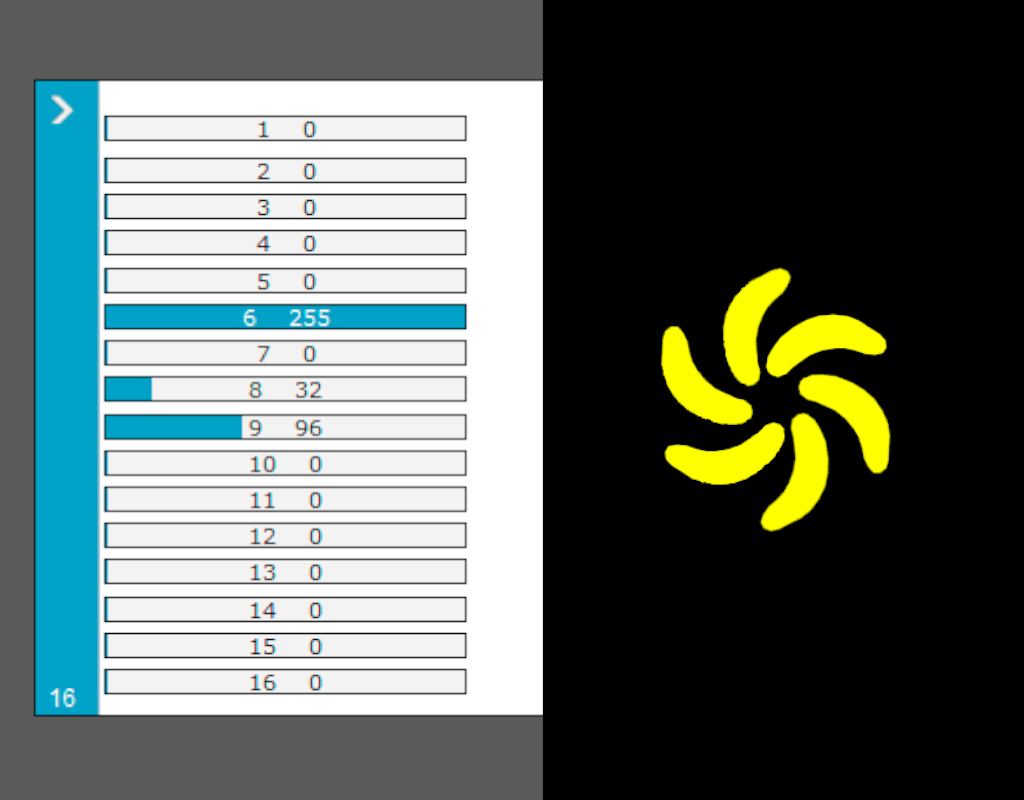 * Verifique, con un Fixture de pruebas (click), que coincidan estos canales: 6 Dimmer, 8 en el valor 32 = Color Amarillo, 9 en el valor 96 = Gobo de la tercer foto.