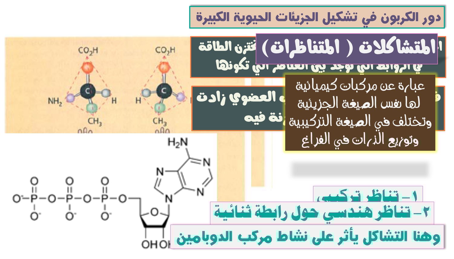 يحتوي العرض على شرح درس الجزيئات الحيوية ودور الكربون في سشكيلها للصف الحادي عشر