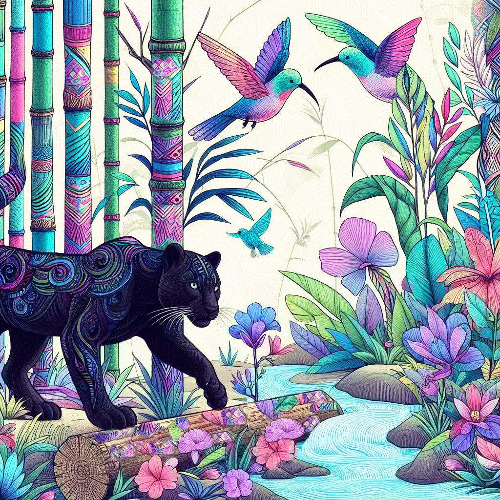 Black panther in a jungle with bamboo which is patterned around him & a tall colourful exotic plants & blue & purple flowers & little river. There are humming birds & a big fallen log with colourful patterns through it.