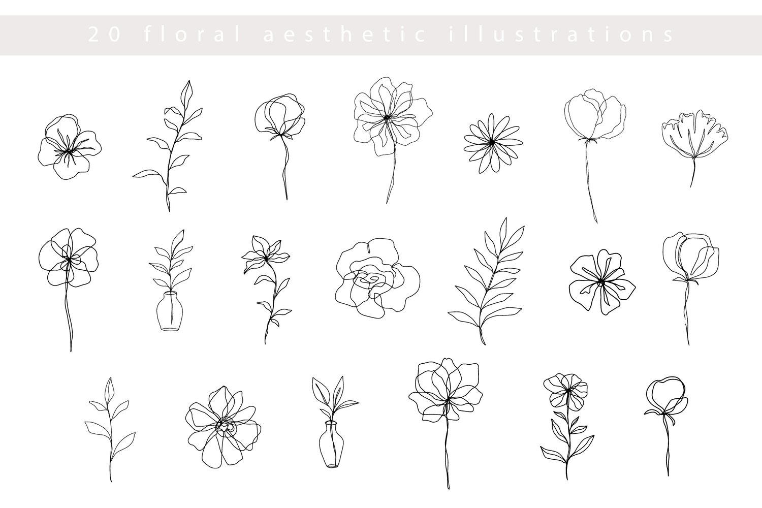 - 20 ONE LINE ART FLORAL ELEMENTS (AI, EPS and PNG files in black and color versions)