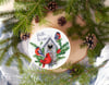 Winter birds, birdhouses, fir twigs. Red cardinal, robin, blue jay, bullfinch.