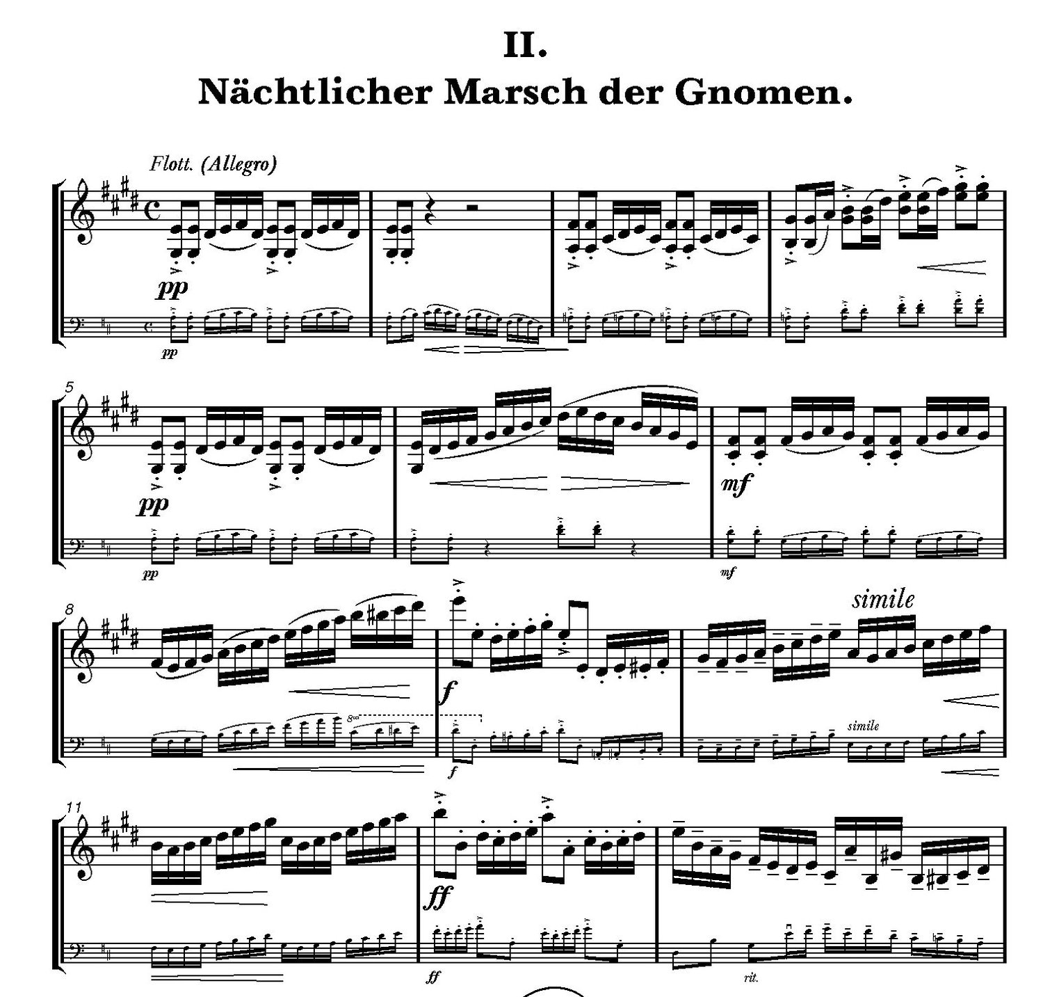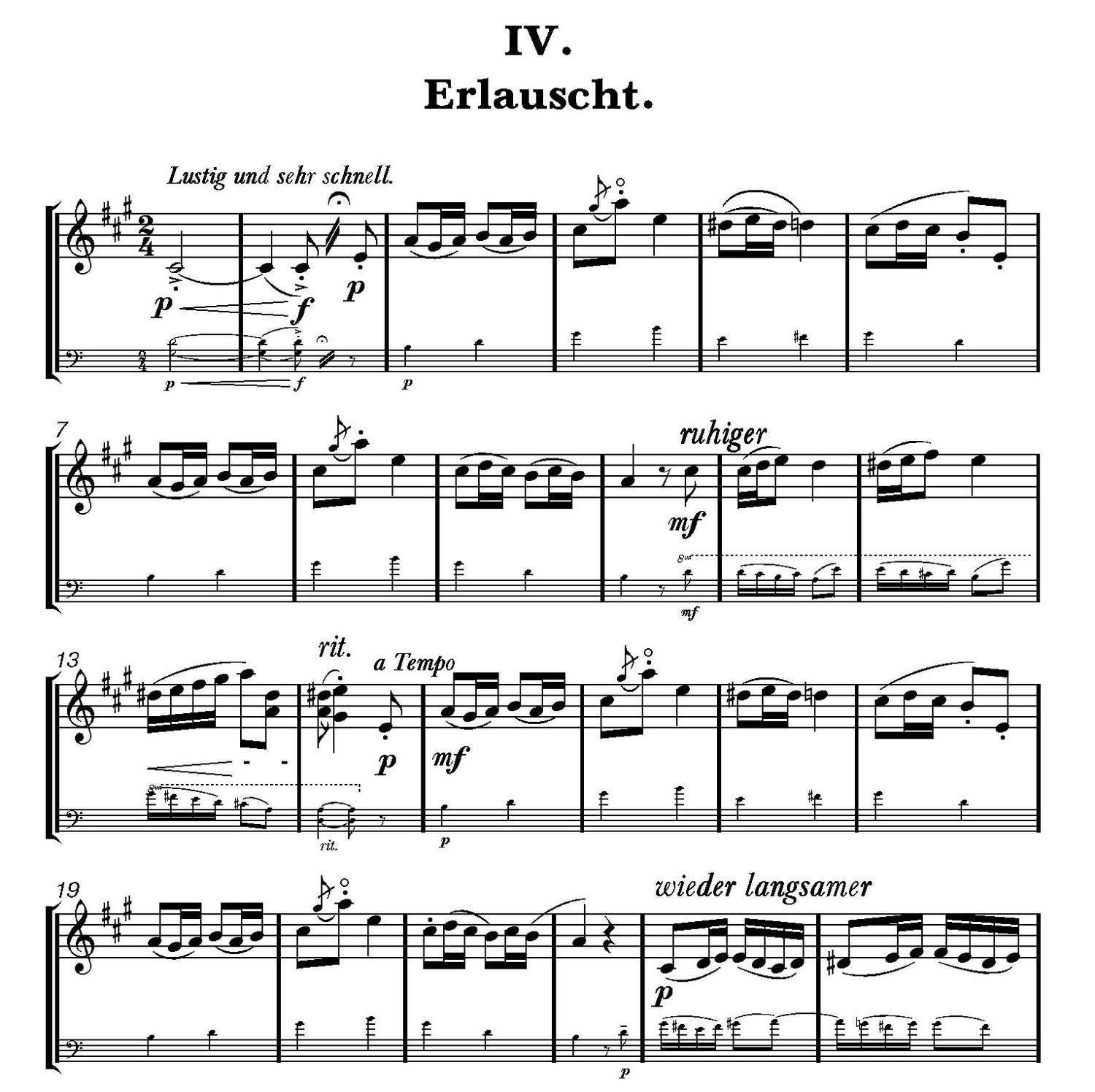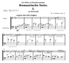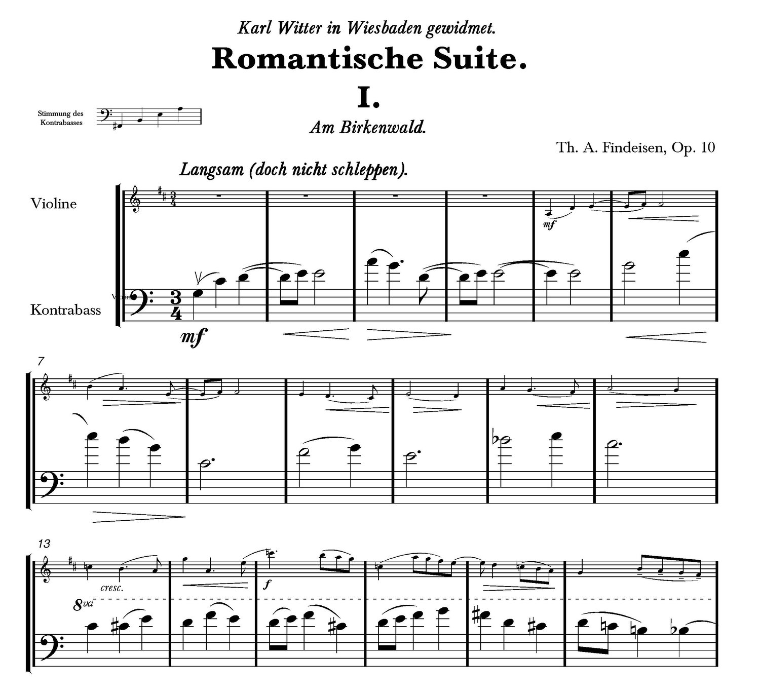 The "Romantic Suite" for violin and double bass by the well-known double bass pedagogue and virtuoso consists of 4 character pieces, each of which Findeisen has given its own romantic title: 1st "Am Birkenwald", 2nd "Nächtlicher Marsch der Gnomen", 3rd "Unterm Haselbusch" and 4th "Erlauscht". In combination with the corresponding tempo indications, it is easy to imagine the characteristics of the movements. The parts are quite demanding for both instruments. The double bass part is notated in solo tuning (one tone lower).