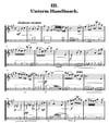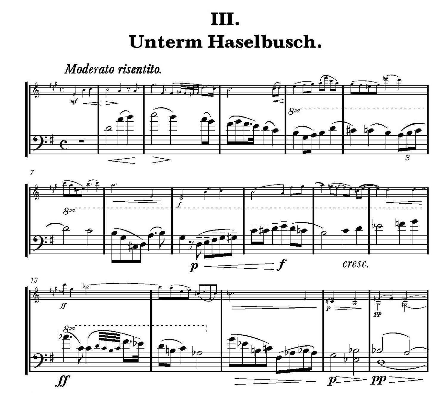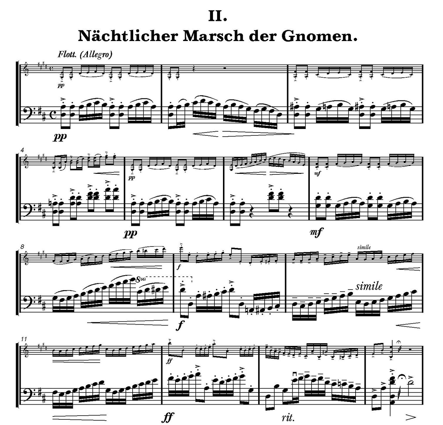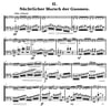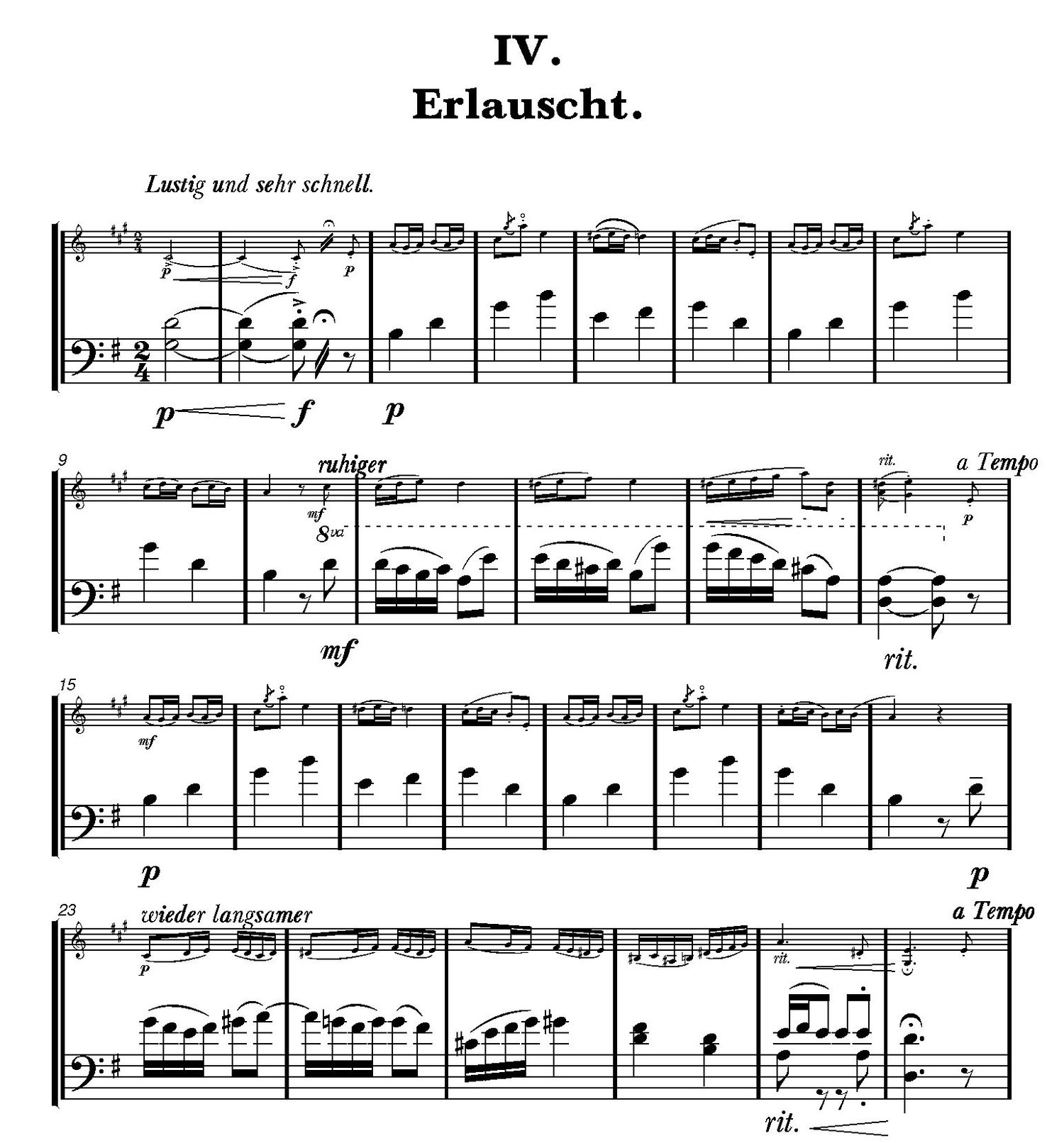 The "Romantic Suite" for violin and double bass by the well-known double bass pedagogue and virtuoso consists of 4 character pieces, each of which Findeisen has given its own romantic title: 1st "Am Birkenwald", 2nd "Nächtlicher Marsch der Gnomen", 3rd "Unterm Haselbusch" and 4th "Erlauscht". In combination with the corresponding tempo indications, it is easy to imagine the characteristics of the movements. The parts are quite demanding for both instruments. The double bass part is notated in solo tuning (one tone lower).