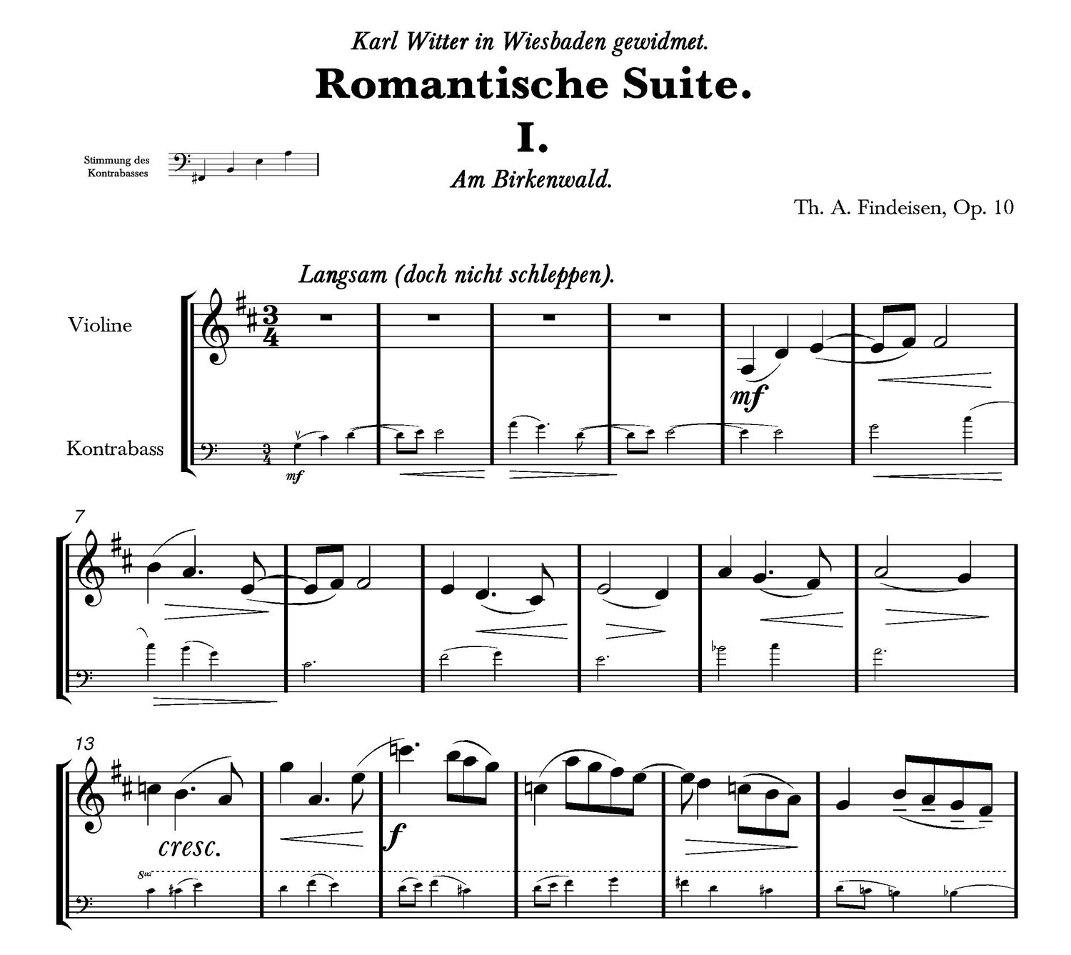 Die „Romantische Suite“ für Violine und Kontrabass des bekannten Kontrabass-Pädagogen und -Virtuosen besteht aus 4 Charakterstücken, denen Findeisen jeweils eigene romantische Titel gegeben hat: 1. „Am Birkenwald“, 2. „Nächtlicher Marsch der Gnomen“, 3. „Unterm Haselbusch“ und 4. „Erlauscht“. In Kombination mit den zugehörigen Tempoangaben kann man sich gut vorstellen, welche Charaktereigenschaften die Sätze haben. Die Stimmen sind für beide Instrumente recht anspruchsvoll. Die Kontrabass-Stimme ist in Solostimmung (einen Ton tiefer) notiert.