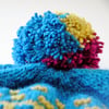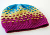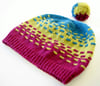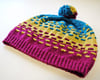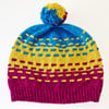 The pattern uses the following techniques: working in the round using a short circular needle, twisted stitches, slipped stitches, basic decreases. Ability to work from chart is recommended but written instructions are also provided for the slipped-stitch pattern. The pattern assumes knowledge of the long-tail cast on.A photo tutorial for making a three-color removable pom pom is included.