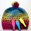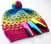 Seeing these three colors together reminded me immediately of highlighter pens. These pops of color will surely make your hat stand out in the crowd!Highlighter Hat is made of fun color blocks in three contrasting colors. Alternating sections of stockinette and an easy slipped-stitch pattern make this a quick and enjoyable knit. The hat is available in two styles: a closer-fitting beanie and a more relaxed, slouchy style. With or without a pom pom? Why not try both: the pattern includes a photo-tutorial for making a three-color removable pom pom.