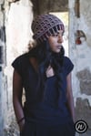 Each Hat in the Convergence collection is worked sideways in two colours of DK weight yarn. The patterns can be adjusted for different head circumferences by adding or removing panels, and each pattern also includes an adjustment point for length.
