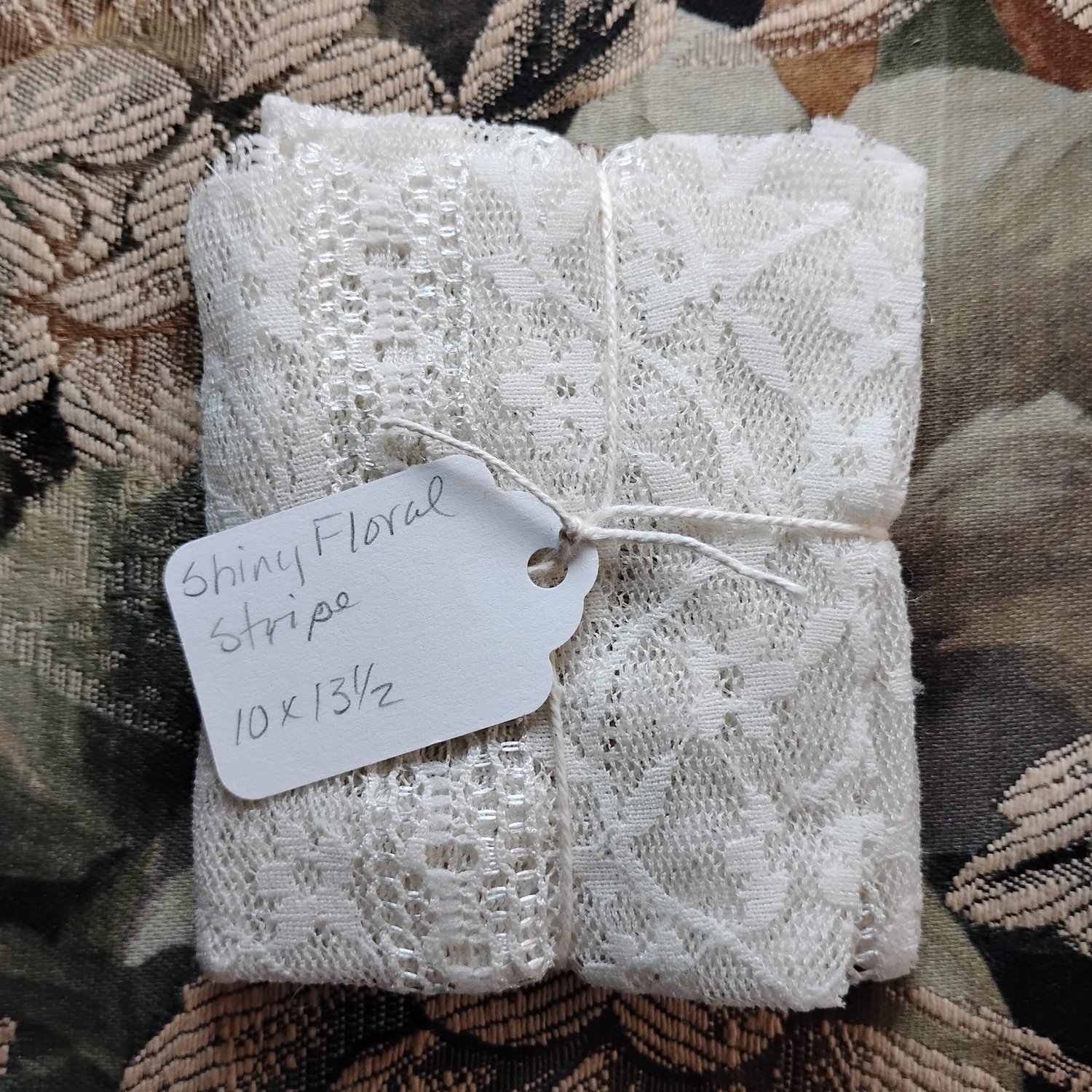 A delicate lace with stripes that glint in the light when seen at an angle.