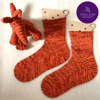 Orange socks: Needle and Fred 4-ply fingering [4 ply; 425 m (464 yds) per 100 g skein; 75% Blue Faced Leicester, 25% nylon] in the colourway Marma-Lady and size E for a UK women’s size 7 foot [foot length 25 cm (9.75 in)]. The sample socks used 298 m (326 yds) of yarn and have a heel flap and gusset. Yarn support was provided by Needle and Fred; you can find all their yarns on their website: https://needleandfred.shop/