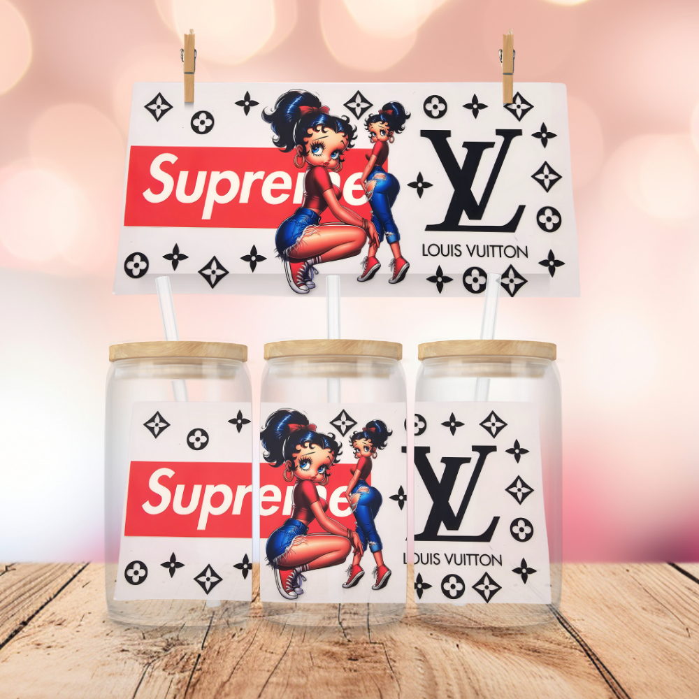 Bring ultimate drip to your drinkware with this fierce Supreme x LV-inspired wrap featuring the unstoppable Miss B! Designed to wrap around 16 oz Libbey glass cups or tumblers, this design blends high-fashion with streetwear edge for a look that demands attention.