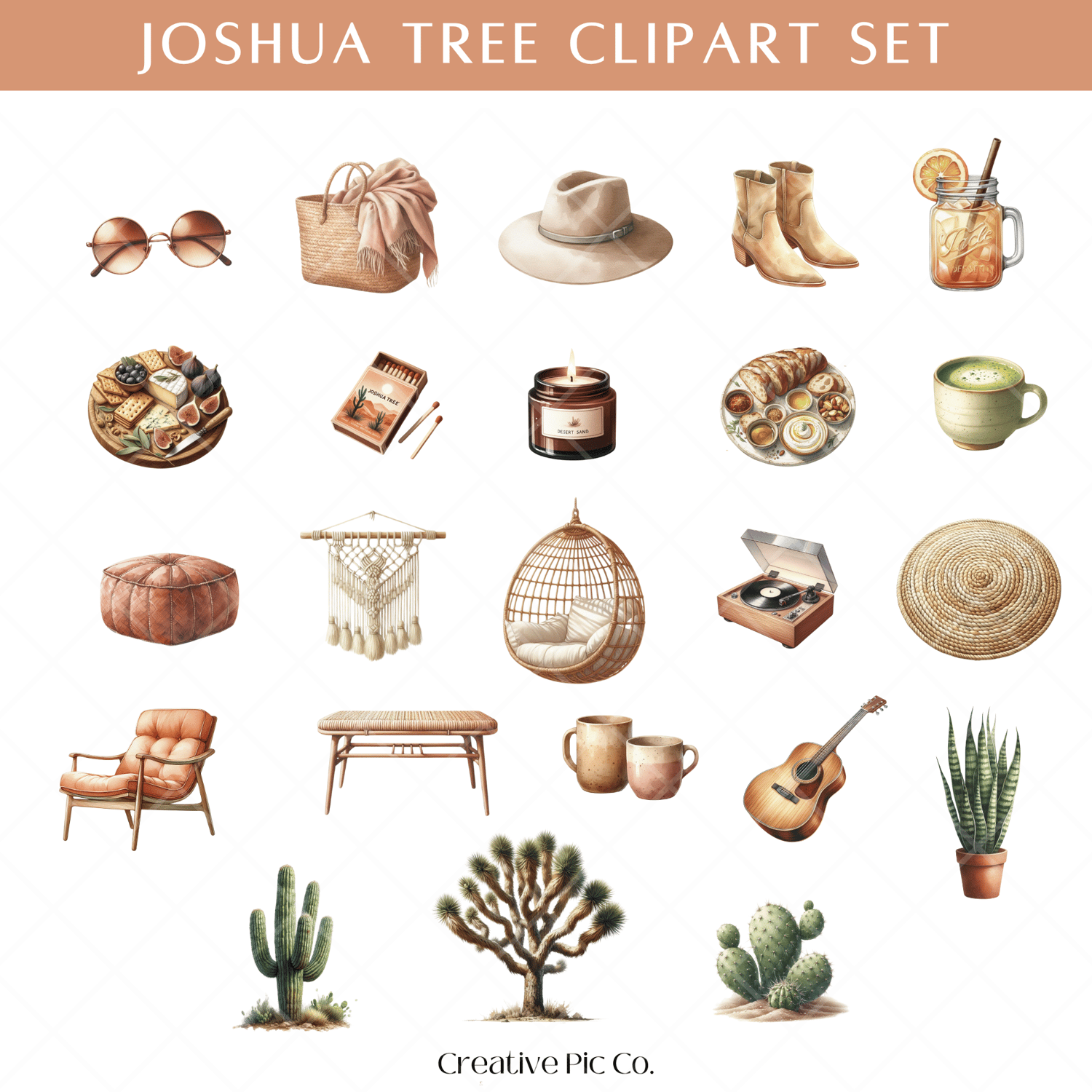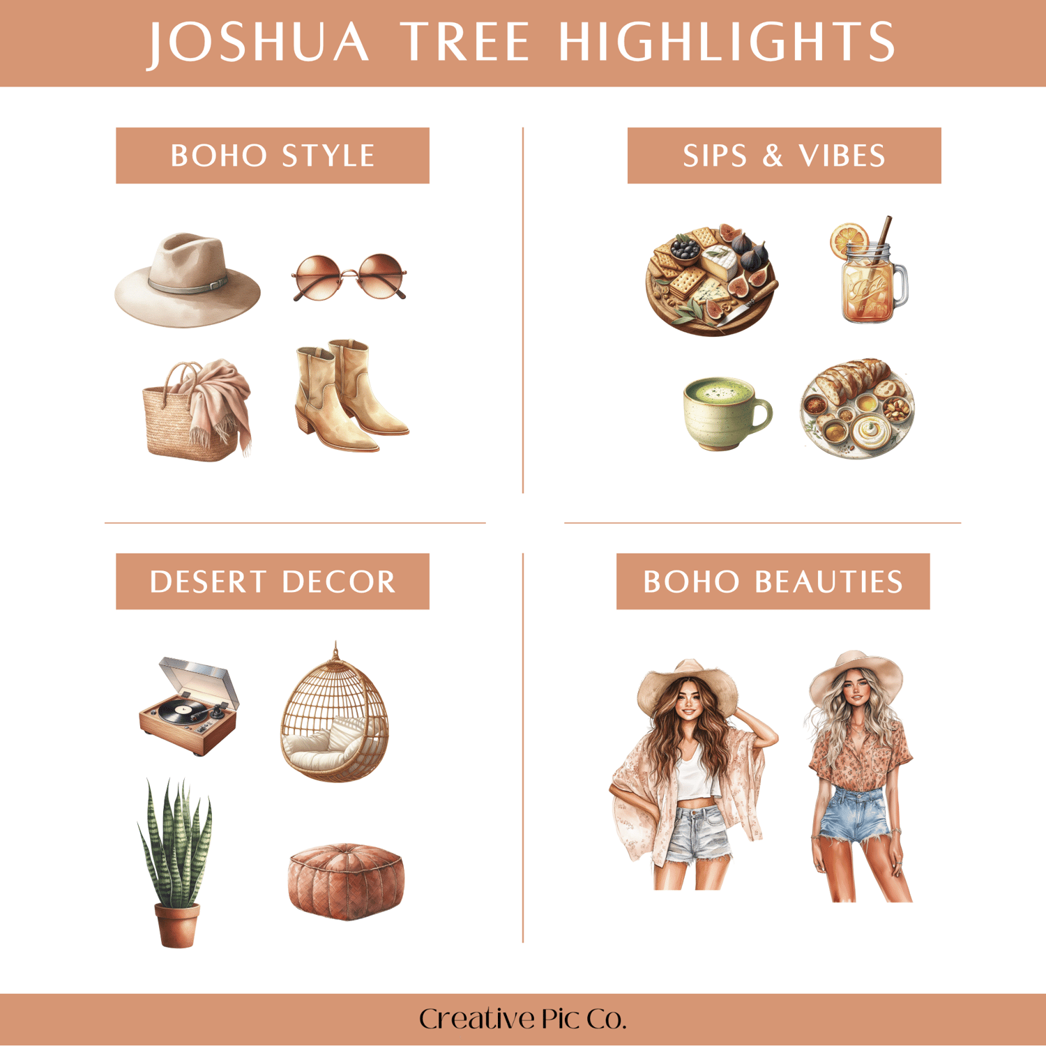 Bring the warmth of the desert to your creative projects with this Joshua Tree Clipart Set. Featuring 35 high-res PNGs including fashion girls, cactus plants, cosy interiors, macramé, and boho décor, perfect for digital planners, branding, social posts, or printables. All elements come with transparent backgrounds and include a small commercial license.