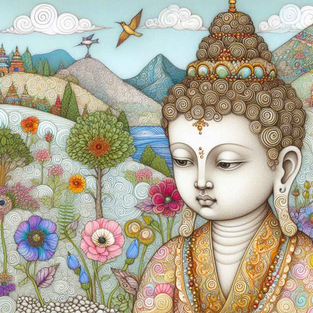 Beautiful child buddha with patterned mountains, a lake, flowers, trees & humming birds.