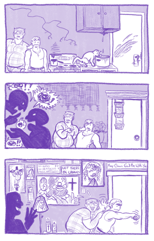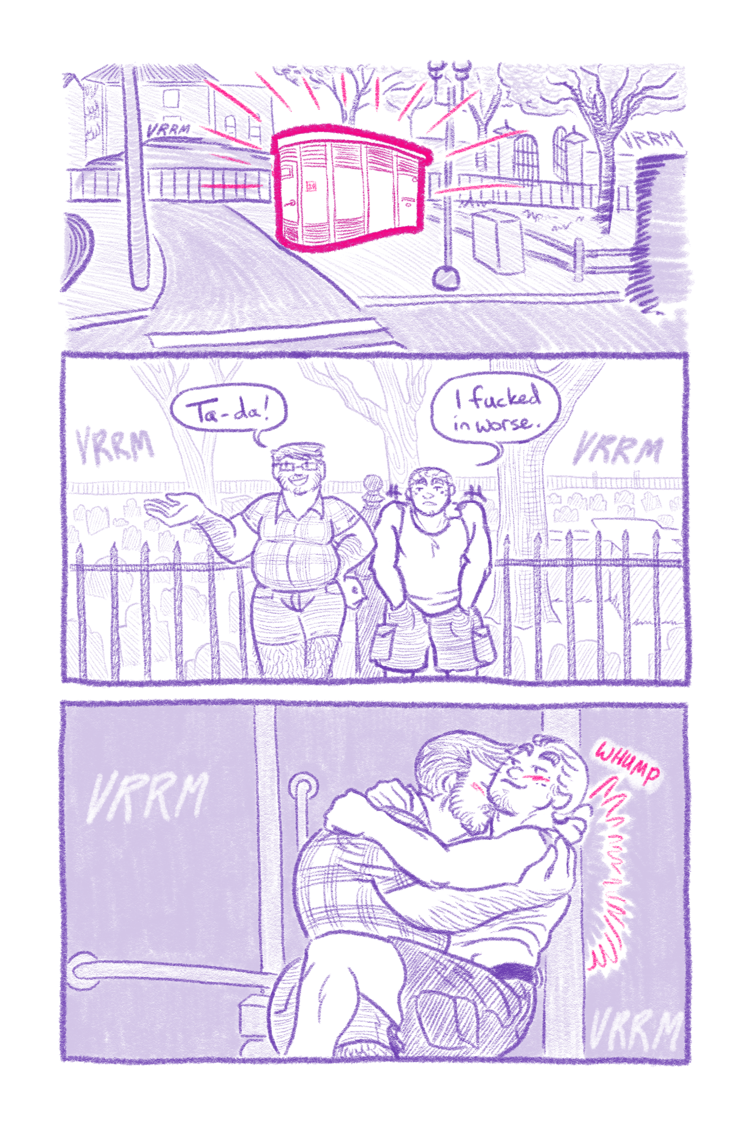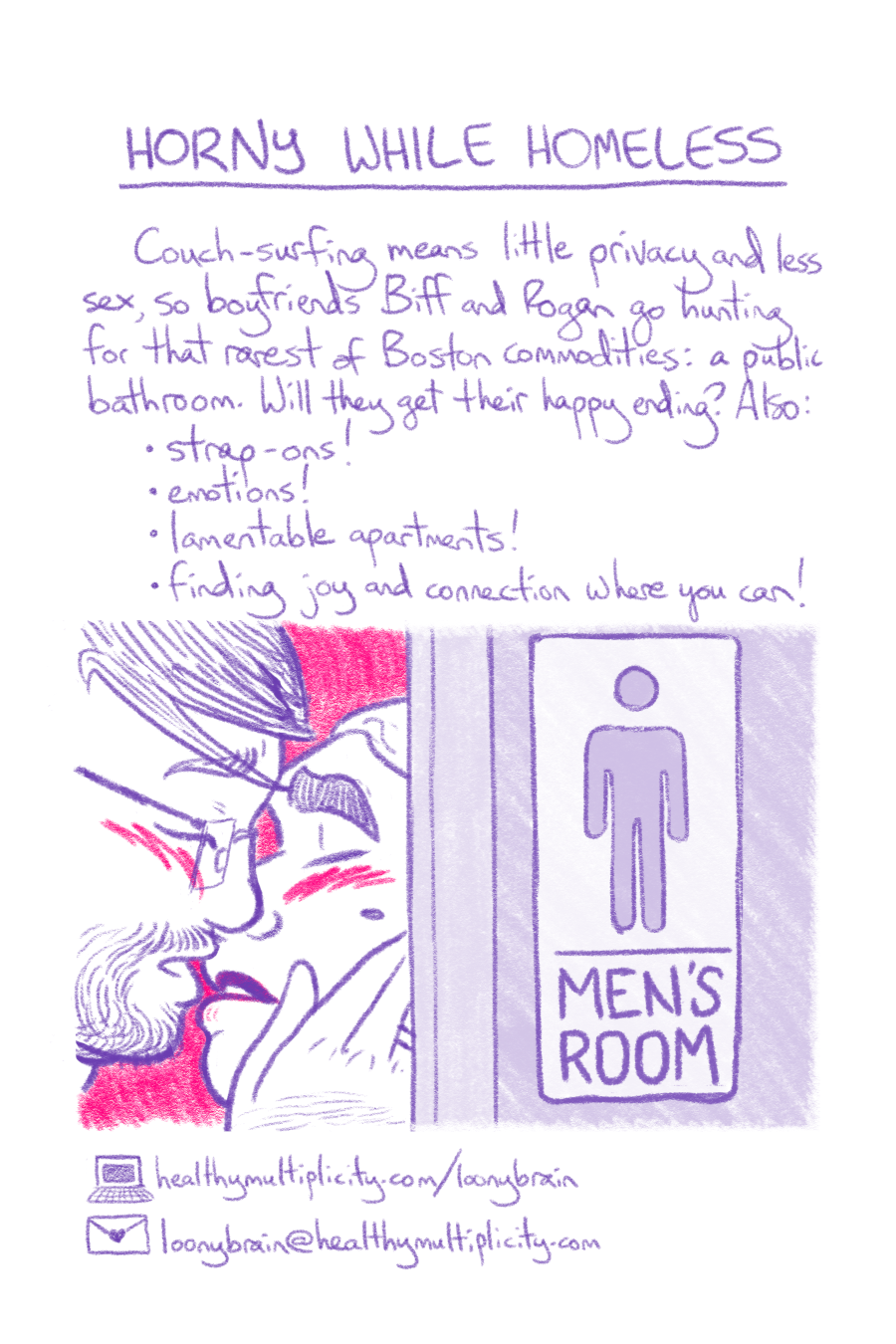 Trans boyfriends Rogan and Biff have been couch-surfing for too long. Biff's sexually frustrated, Rogan is stressed out, so it's time to go hunting for that rarest of Boston commodities: a public bathroom (and also an affordable place to live). Will they get their happy ending? (Yes.) Also: