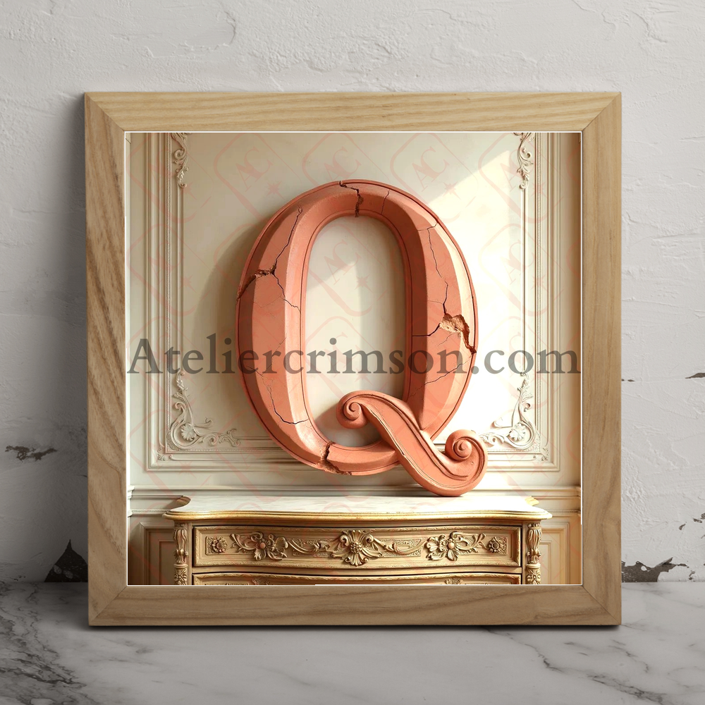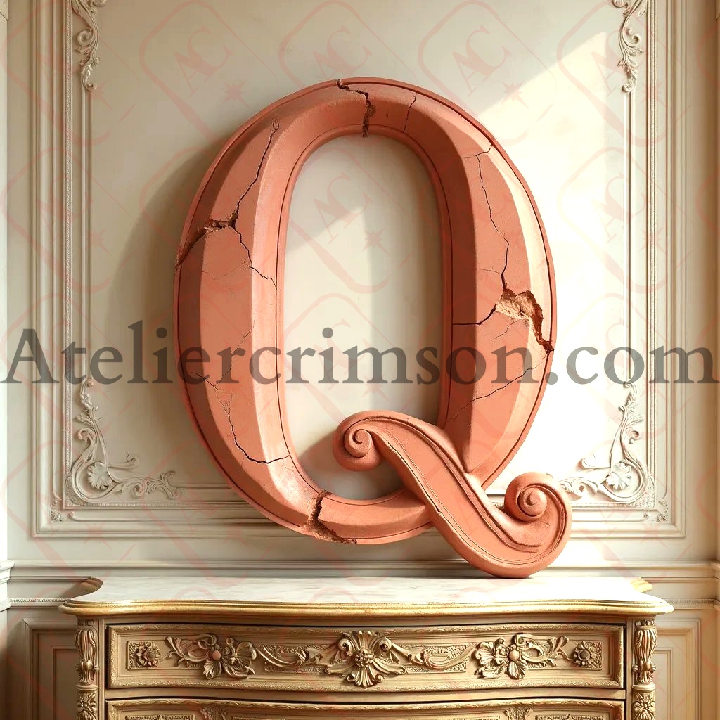 The letter Q terracotta Art Nouveau typeface inspired by Alphonse Mucha's with flowing lines and floral motifs, set against a soft, muted background with a gilded wooden dresser and subtle lighting effects.