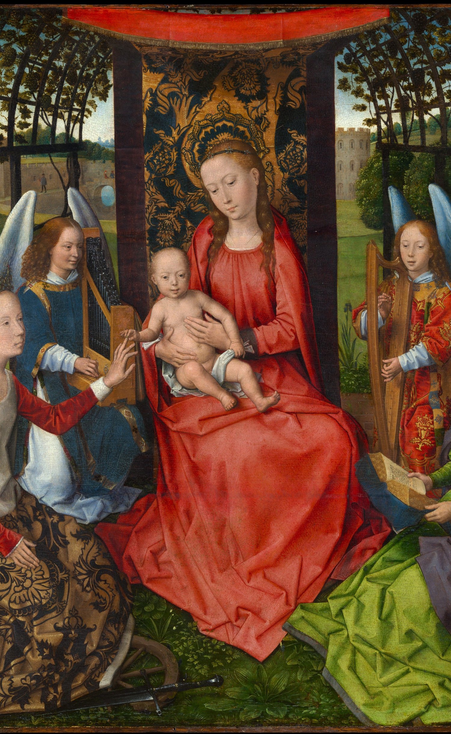 A serene Madonna and Child surrounded by angels and saints, from a painting by the great master of the Northern Renaissance, Hans Memling. Memling’s tender stillness and intensely saturated colours give this small scene the intimacy of adoration.
