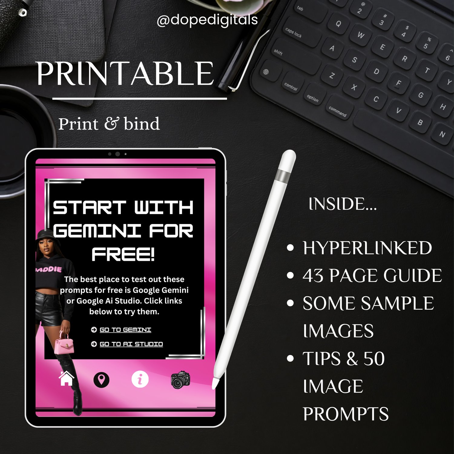 #AI Baddie Guide, AI Prompt Book, Google Gemini Image Guide, Nano Banana Prompts, AI Art for Creators, AI Model Prompts, Digital Baddie Aesthetic, Dope Digitals Guide, AI Influencer Toolkit, AI Image Generator Prompts, AI Creator Resources, AI Stock Image Guide, Printable AI Workbook, Jo Reeves AI Guide