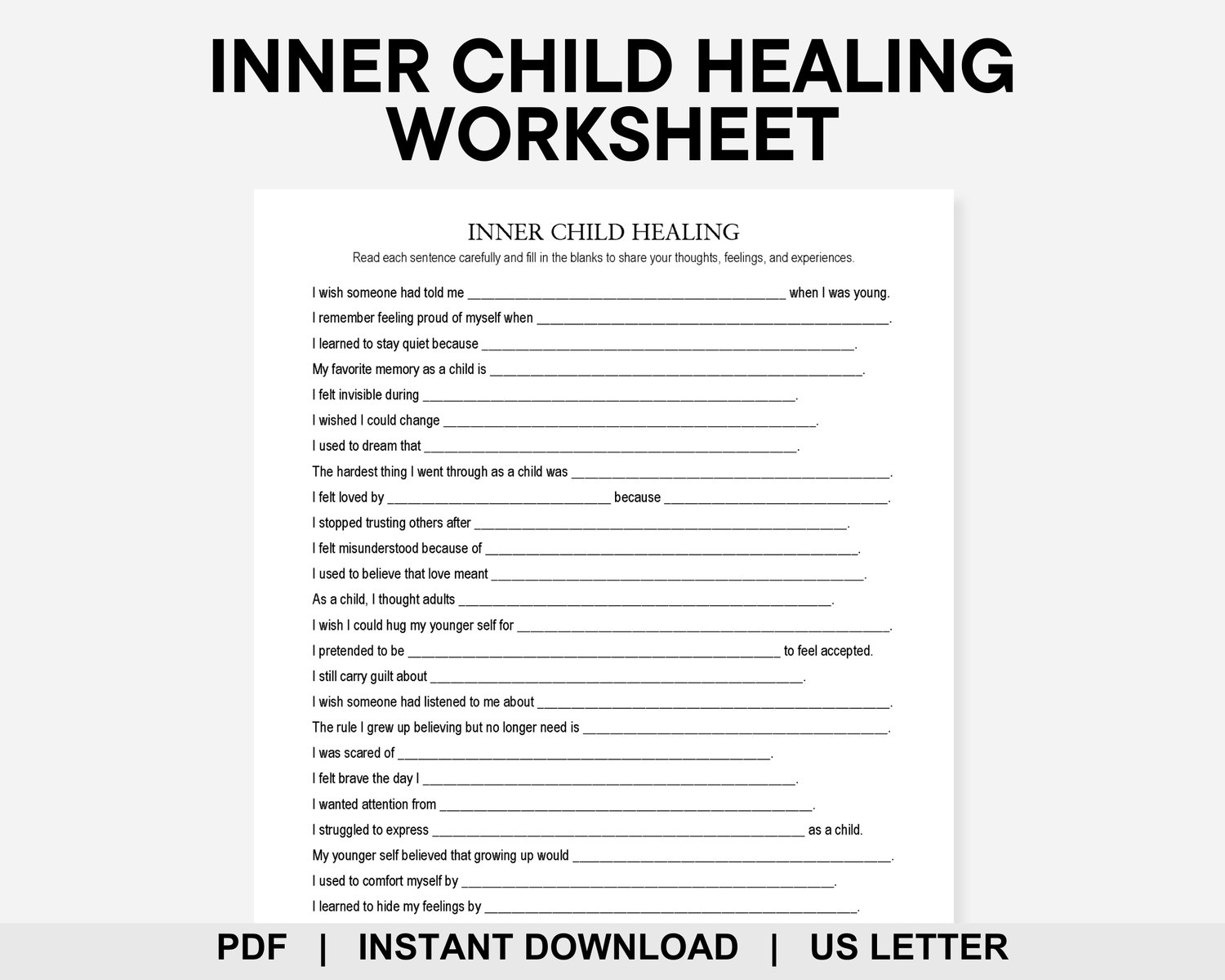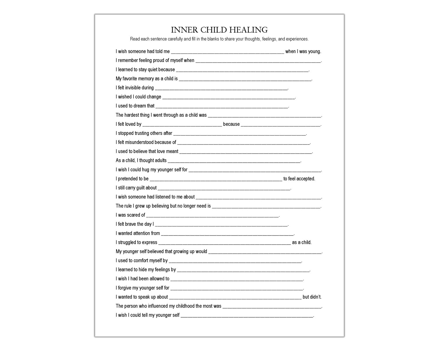 Reconnect with your younger self and take an active step toward your own emotional freedom. This Inner Child Healing worksheet features 30 prompts to help you identify what your inner child truly needed back then. Use it for therapy sessions, journaling, or self-reflection to acknowledge your inner self and foster emotional growth. Welcome home your inner child!