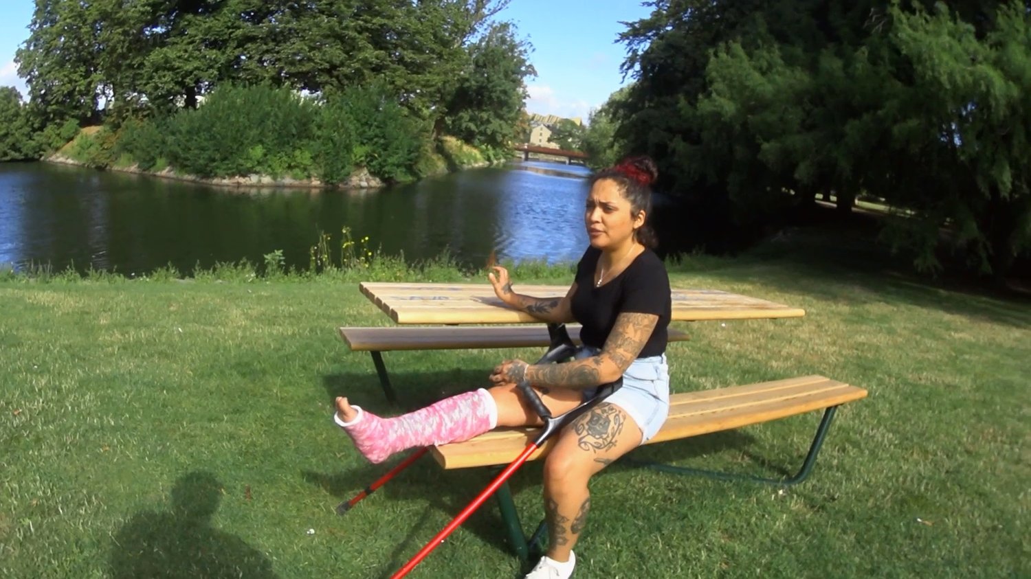 Alexie sits on a bench and looks out over the river in his hometown.She has her pink camouflage cast up on the bench and we take the chance to take some close-ups of it before Alexia herself borrows the camera to film.After a while, Alexia takes her crutches and follows the river out of the park before crossing a street to the parked car.
