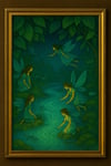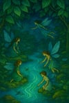 In this lush twilight scene, four fairies gather around a glowing turquoise stream, surrounded by vivid greenery and dappled light. Each fairy interacts with the enchanted landscape — some in flight, others perched by the river’s edge — creating a peaceful yet powerful atmosphere of movement and serenity.