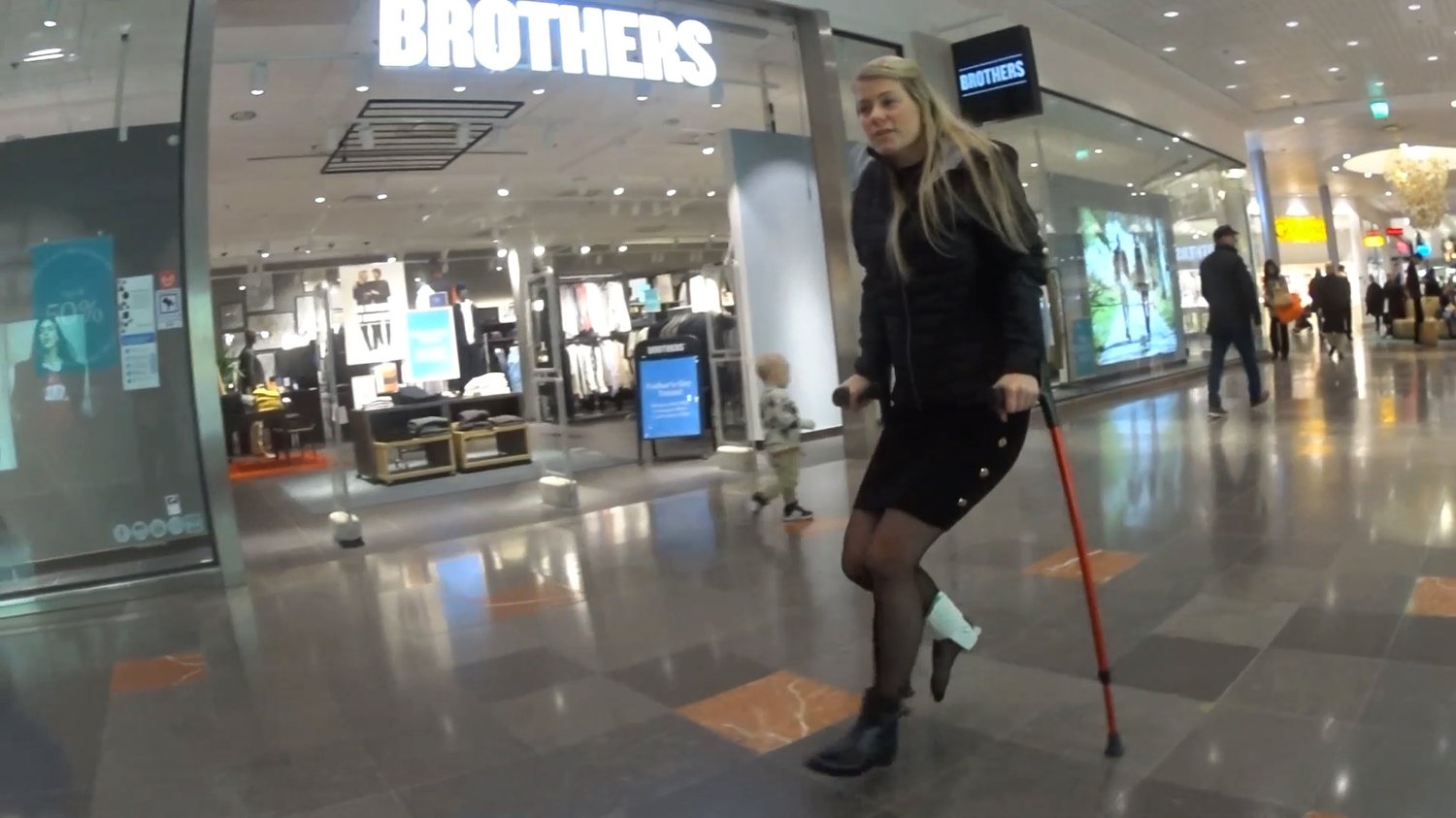 Ice gets out from the car with a aircast on her right sprained ankle.She has today a black dress under her black jacket and she also wear black pantyhose and a black boot on her left foot.She crutch in to the mall and then in to the store rhere she pick up some clothes that she has ordered.She then crutch around in the mall just so we can see how goos she is on her crutches today.